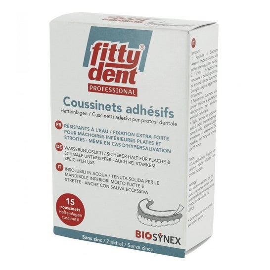 Almofadas adesivas extra fortes para próteses dentárias que são elaboradas sem zinco e são resistentes à água, para garantir sua fixação durante a salivação.
