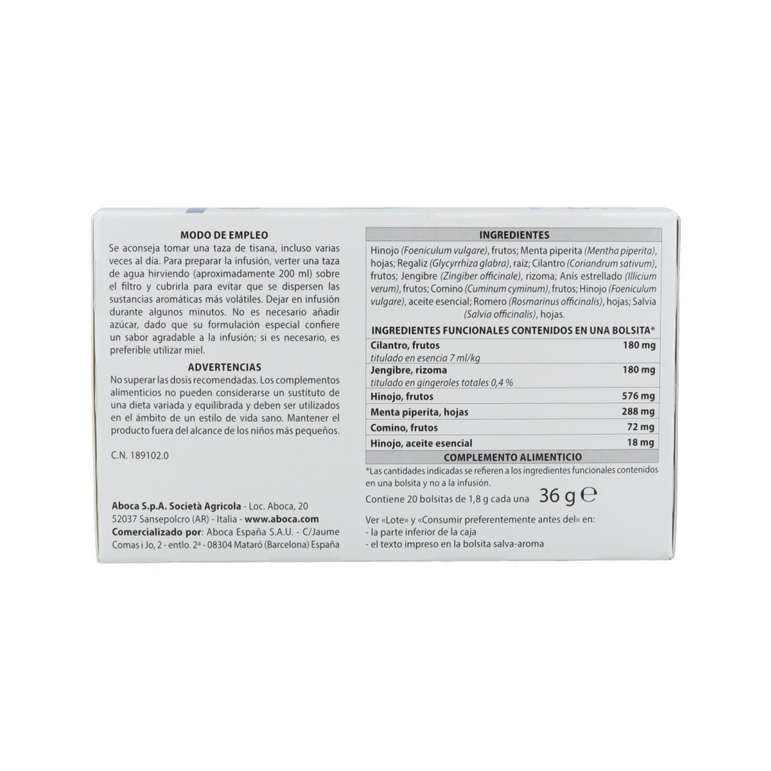 Feito de funcho, que ajuda no inchaço e na tensão abdominal. Contém também extractos de coentros liofilizados, para o equilíbrio fisiológico do gás, e gengibre, cominho e chicória, que ajudam à digestão.