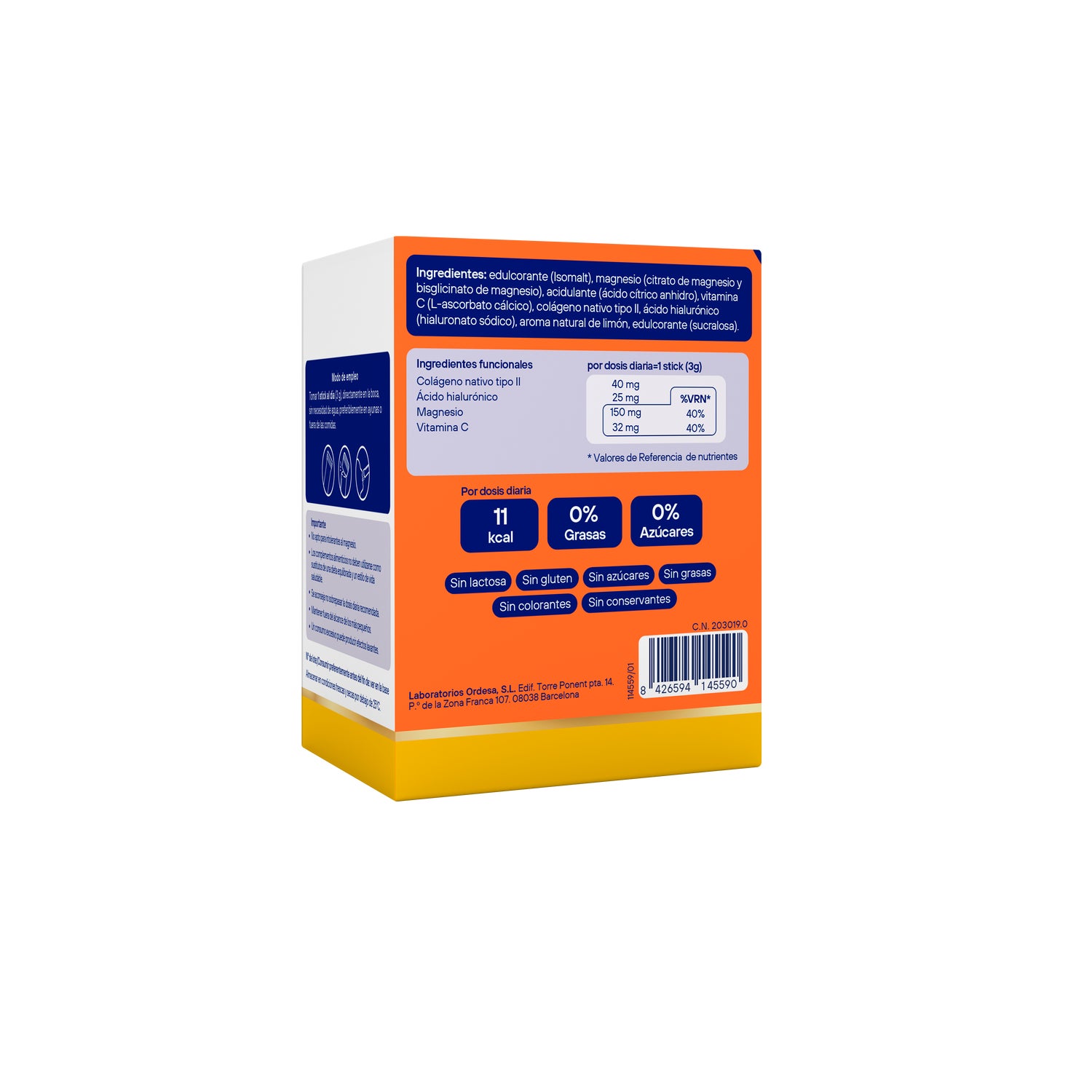 É elaborado à base de colágeno tipo II, ácido hialurônico, magnésio e vitamina C.