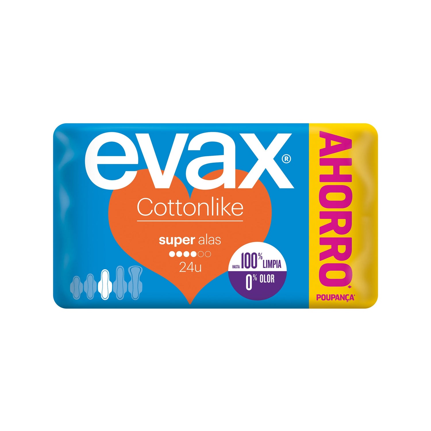 EVAX Cottonlike Cottonlike Winged Compress 24Uds é uma confortável compressa com a qual se sentirá sempre limpo. Tem uma camada superior, com um toque agradável graças ao algodão, que evita irritar e alterar a sua pele.