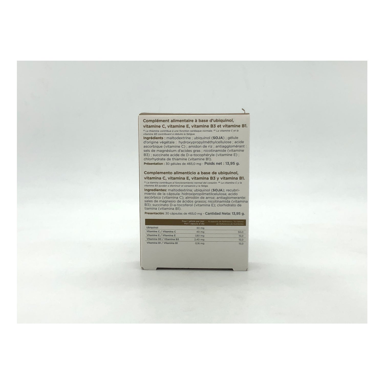 Suplemento alimentar à base de ubiquinol, vitamina C, vitamina E, vitamina B3 e vitamina B1. O ubiquinol contribui com propriedades benéficas a nível cardiovascular, no stress oxidativo, na recuperação dos atletas e na fadiga em geral. A fórmula associa as vitaminas B1-B3, a vitamina C e a vitamina E para ajudar a repor a energia e os antioxidantes. É particularmente indicado para pessoas que se sentem fatigadas e para pessoas que sofrem diariamente de dores musculares ou cãibras.
