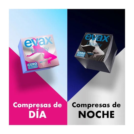 Evax Liberty normal com asas são compressas muito flexíveis para dias de fluxo normal. As suas asas curvas duplas permitem uma adaptação perfeita à sua roupa interior.