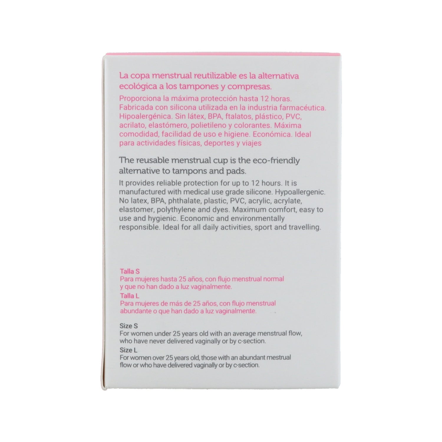 *É um produto completamente atóxico, inalterável, inodoro e esterilizável. Adequado para todos os tipos de mulheres, incluindo aquelas com alergias dermatológicas a tampões ou látex.