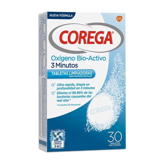 Em apenas alguns minutos, Corega® Bio-Active Oxygen limpa e protege seus dentes graças à sua composição rica em ingredientes ativos antibacterianos e antiplaca.