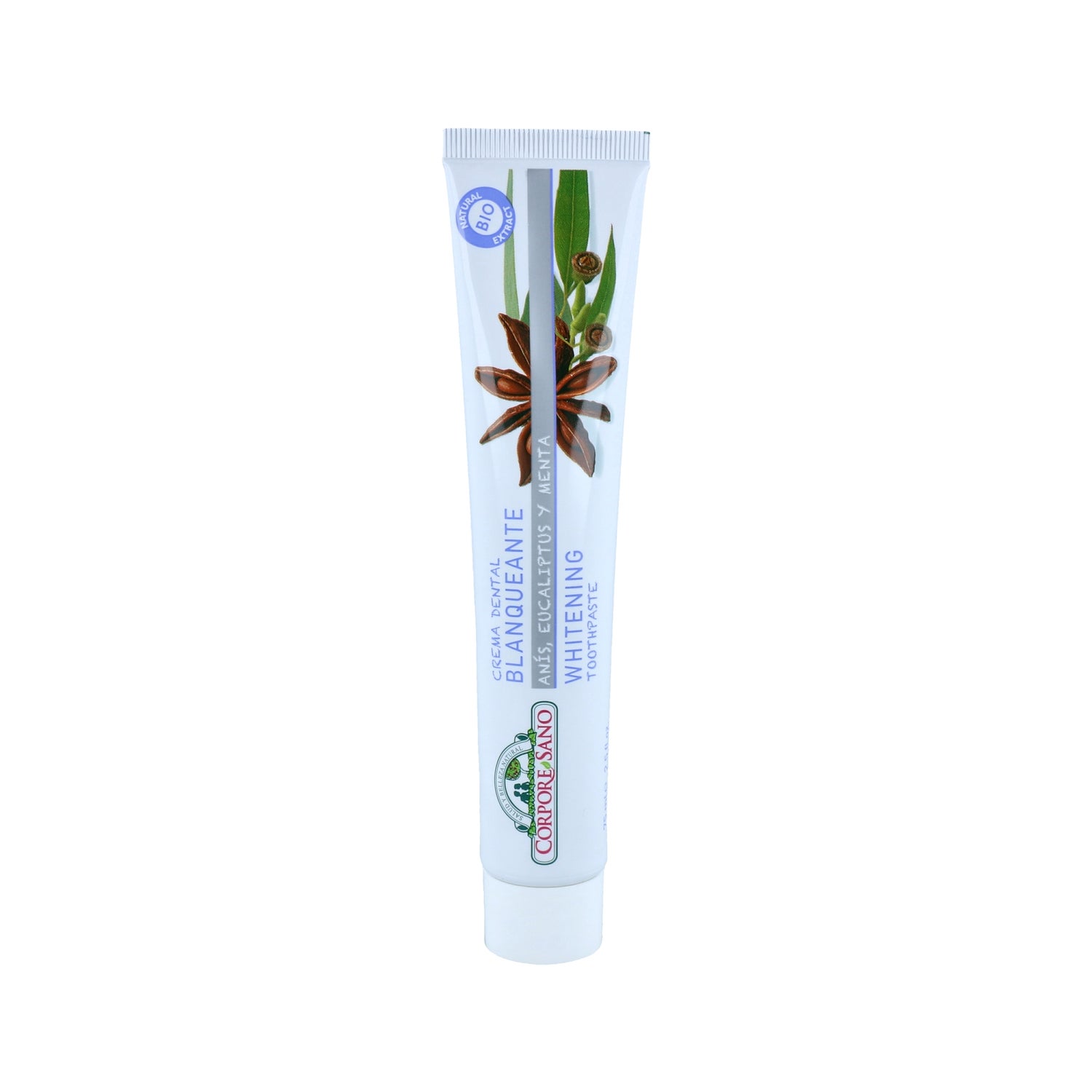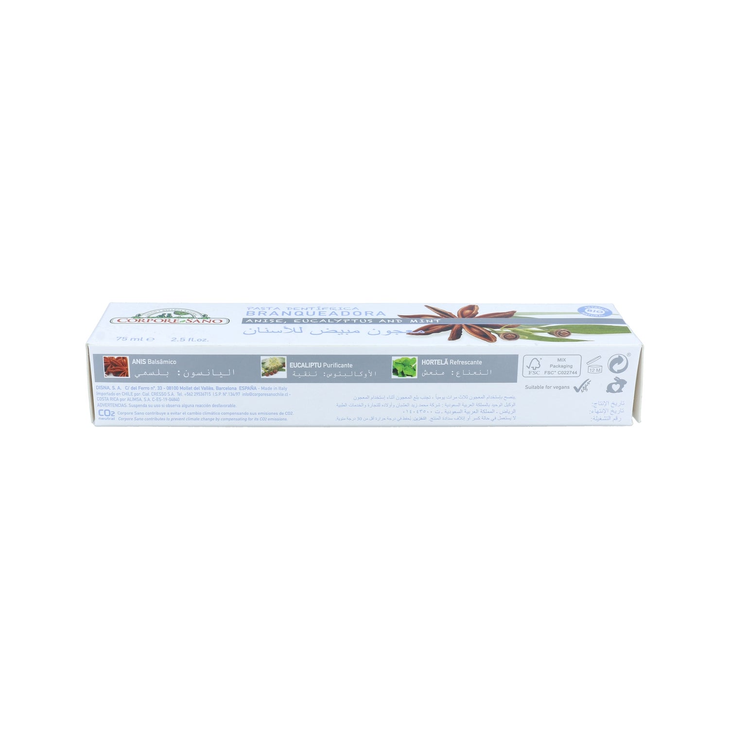 Pasta de dentes em gel com ação branqueadora à base de menta, eucalipto e anis. Ajuda na higiene oral diária e proporciona um hálito fresco. Indicado para utilizadores de aparelhos ortodônticos. Ajuda a eliminar as bactérias que causam o mau hálito. Ajuda a remover a placa bacteriana, protege contra as cáries, ajuda a fortalecer o esmalte dos dentes e a proteger as gengivas. Contém flúor que ajuda a remineralizar os dentes. Efeito de dentes brancos desde a primeira utilização.