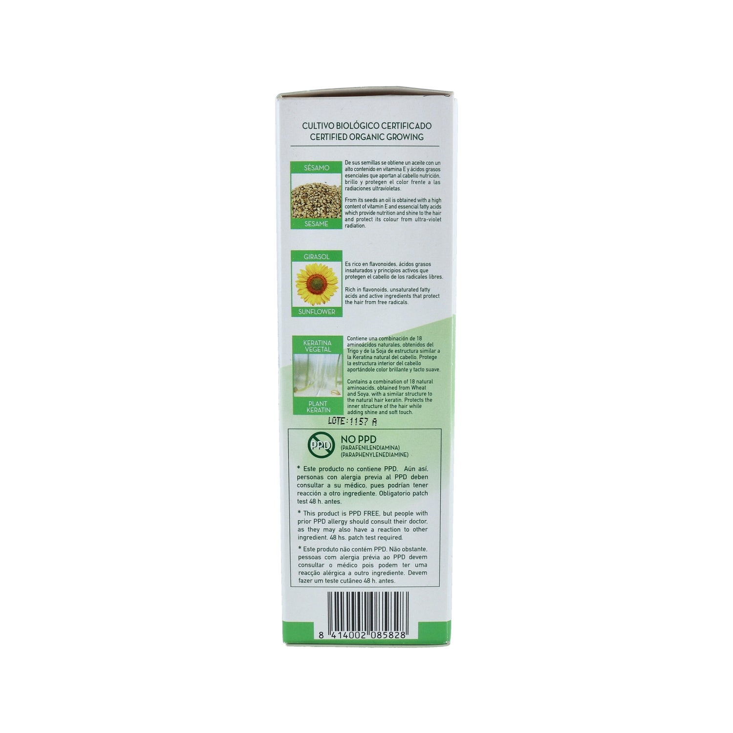 Coloração permanente enriquecida com óleo de Sésamo de cultivo Biológico certificado, extrato de Girassol e Queratina vegetal, que proporcionam ao cabelo uma coloração permanente com uma cor intensa, luminosa e duradoura. Proporciona uma coloração duradoura e proteção do cabelo.