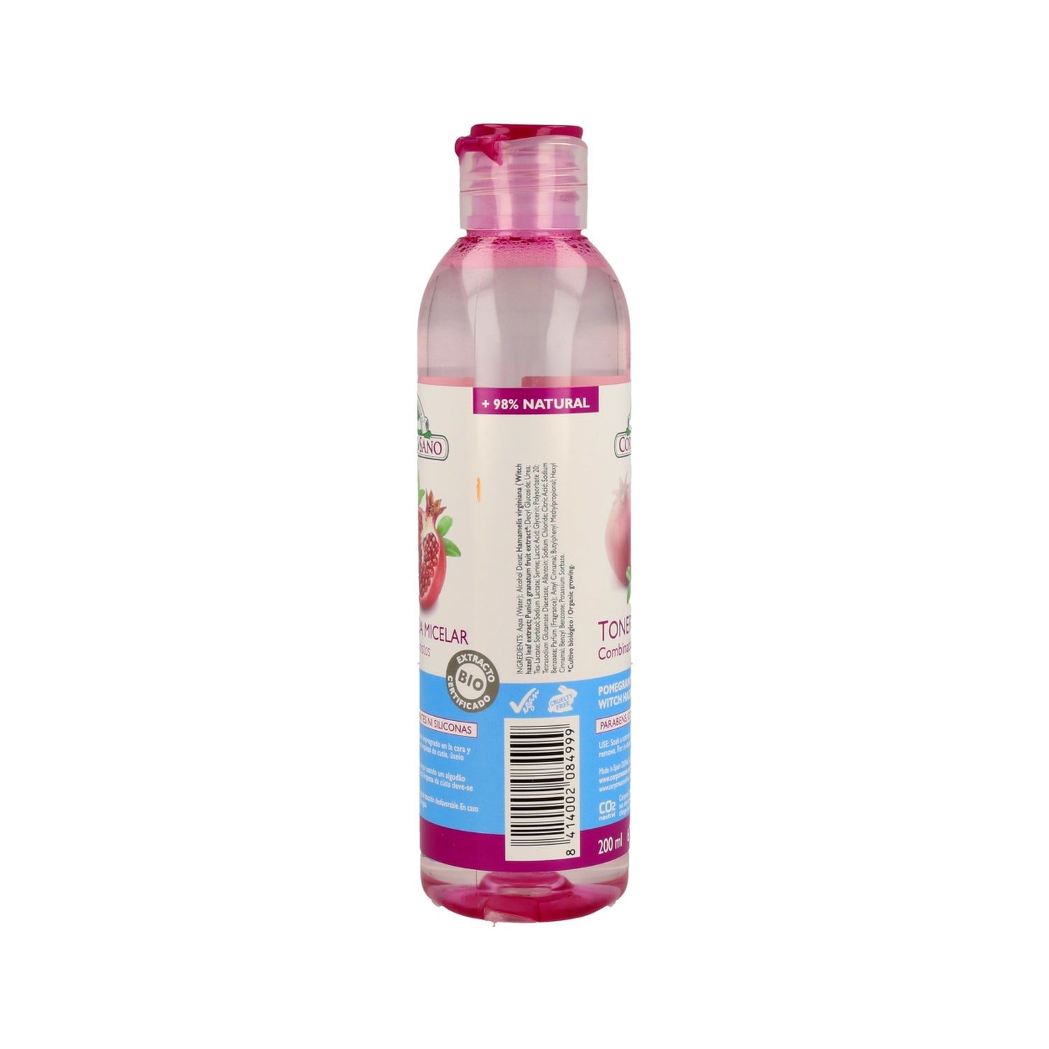 Um tónico micelar feito com extractos vegetais de romã e hamamélis, é ideal para limpar a tez das impurezas, removendo vestígios de maquilhagem e tonificando e hidratando a pele