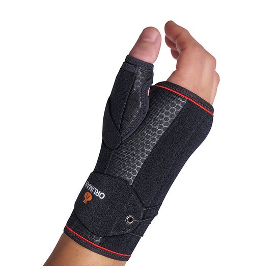 Ortótese da Orliman para imobilizar o cotovelo com extensão até o polegar, indicada em lesões, tratamentos pós-cirúrgicos, fraturas patológicas, entre outros. Indicada para apoio em terapias ou cirurgias dos ligamentos do cotovelo. Peça completa ajustável através de tiras com abertura no cotovelo. Composta por duas partes rígidas que imobilizam o braço e mantêm as articulações com limitações para rodar ou flexionar. Produto composto por uma valva de braço, uma de antebraço e uma tala palmar com abdução do polegar. Estão unidas entre si com uma abertura que regula a flexoextensão em graus de 0° a 90°. Feitas com almofadas, alma de termoplástico para o suporte, têxtil hipoalergénico e veludo perfurado para que respirem as moléculas de suor. Ajustável através de tiras com fivelas e fecho de velcro. Adequado para mulheres e homens.