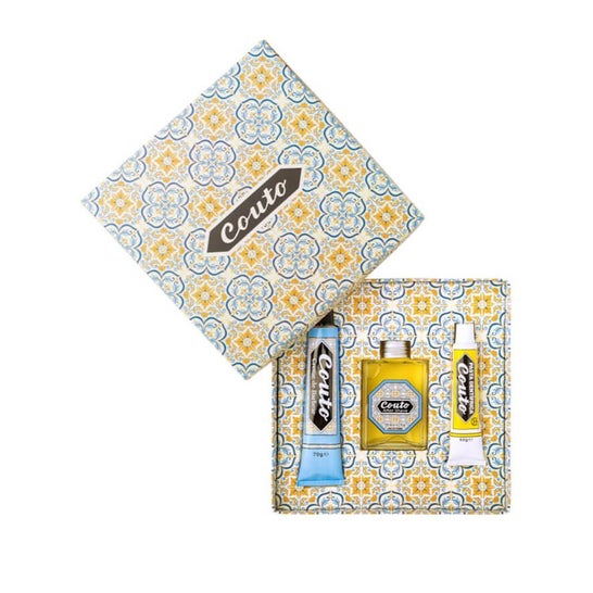 Pack de produtos cosméticos para cuidado e higiene em todos os tipos de pele. Contém um creme de barbear de 70g, formulado com pantenol, glicerina e vitamina E, que ajuda a suavizar a barba e facilita um bom barbear. Com um gel pós-barba de 125ml à base de uma combinação de 6 extratos de plantas e vitaminas que ajudam a acalmar a pele e prevenir a irritação. Inclui uma pasta de dentes de 60ml, indicada para uso diário. Ajuda a manter a boca limpa e proteger o esmalte dental e as gengivas. São produtos dermatologicamente testados e com ingredientes orgânicos. Apresentam-se numa caixa decorada de cartão reciclável.