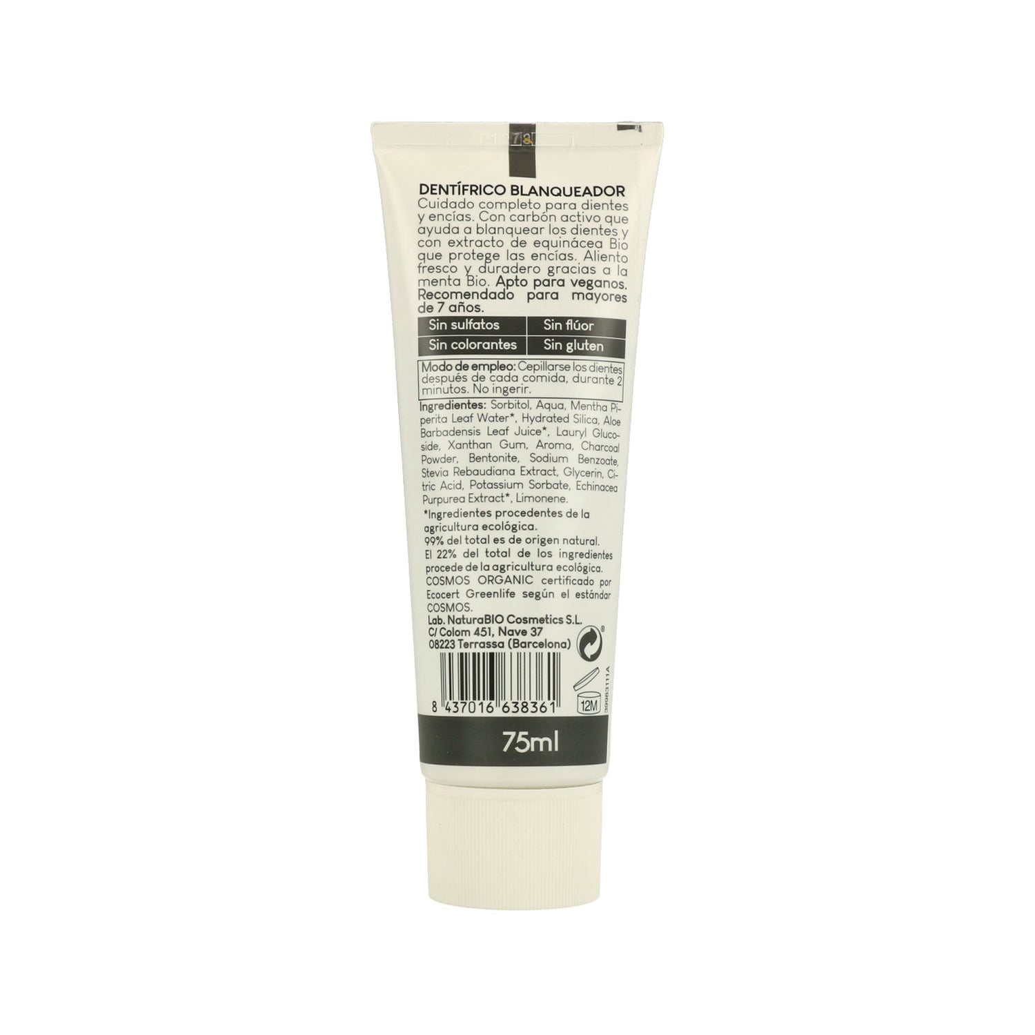 Pasta de dentes branqueadora com carvão ativado para obter um cuidado profundo dos dentes e gengivas ao mesmo tempo que os branqueia, evitando a formação de placa, deixando um hálito fresco e relaxando as gengivas.