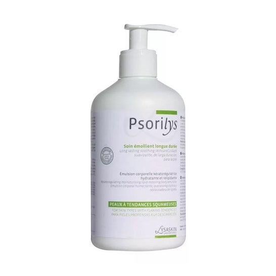 Psorilys Emulsão Emoliente Corporal 500ml é um produto humectante, queratoregulador e restaurador de lípidos que ajuda a manter a pele hidratada, suave e elástica. A sua fórmula contém Urodium, um ingrediente ativo patenteado que potencia a ação humectante da ureia e substâncias reparadoras de lípidos para proteger a barreira cutânea. Recomendado especialmente para peles secas, escamosas e com psoríase, esta emulsão óleo em água proporciona uma hidratação duradoura e protege a pele de agressões externas. De fácil aplicação, absorve-se rapidamente e tem um leve perfume.