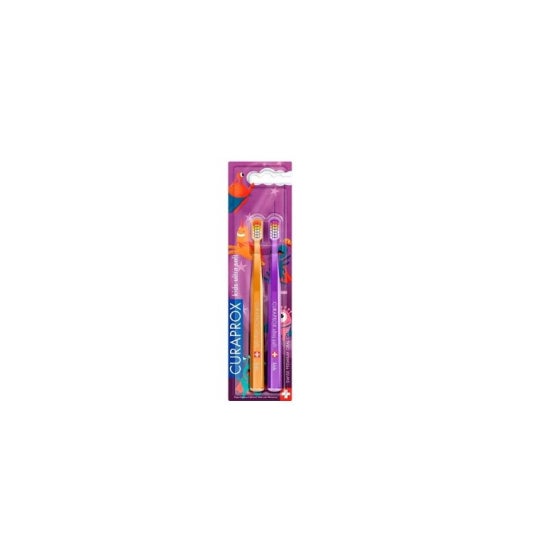 Curaprox Kids Ultra Soft Duo Edição Super-heróis 2ud é um pack de 2 escovas de dentes infantis em cores diferentes.