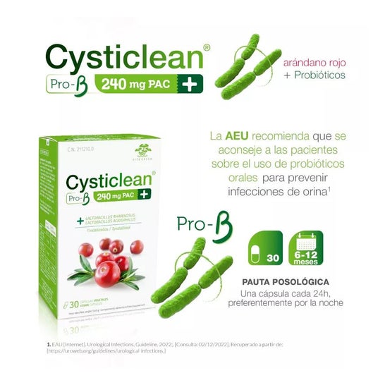 Cysticlean Pro-B 30caps é um complemento alimentar para cuidar do trato urinário. Elaborado à base de extrato seco concentrado de arando vermelho americano rico em proantocianidinas (PAC) e D-manoza, mais Lactobacillus rhamnosus e Lactobacillus acidophilus tindalizados que ajudam a reforçar a sua ação. Indicado para proteger o sistema urinário.