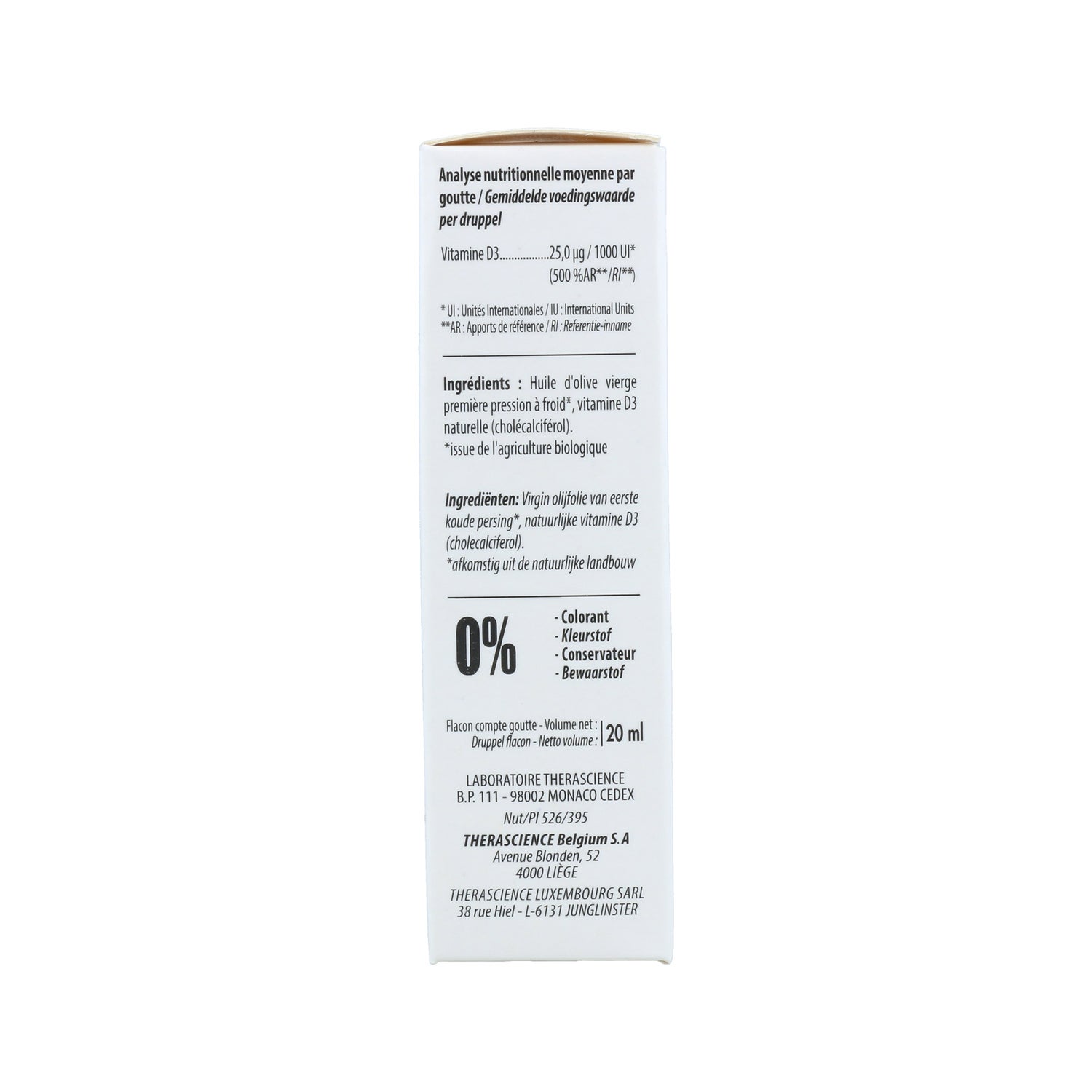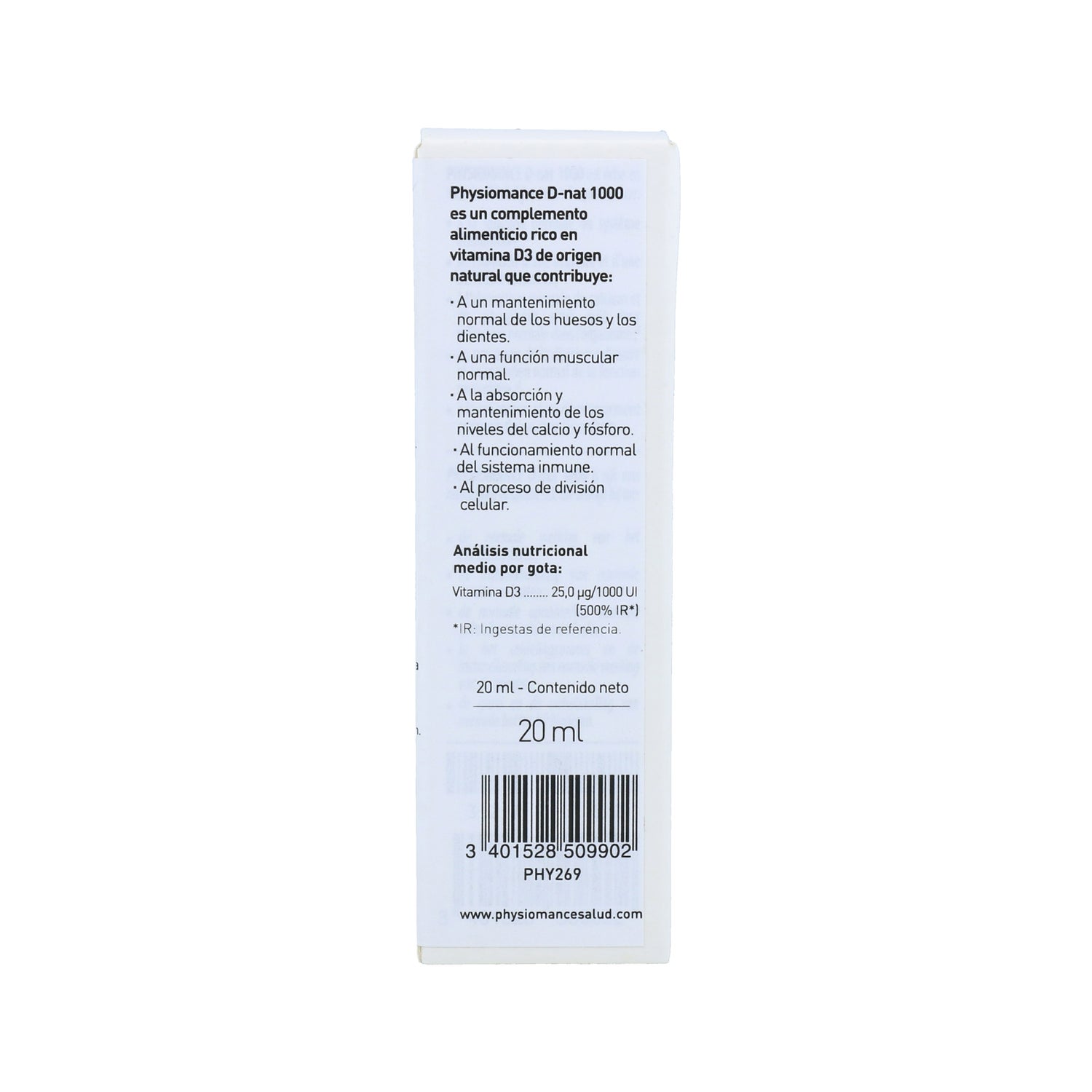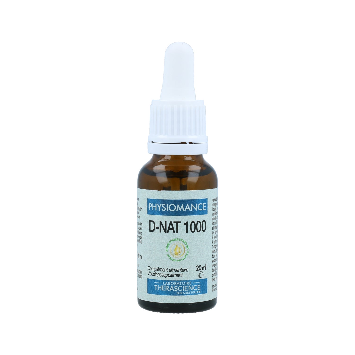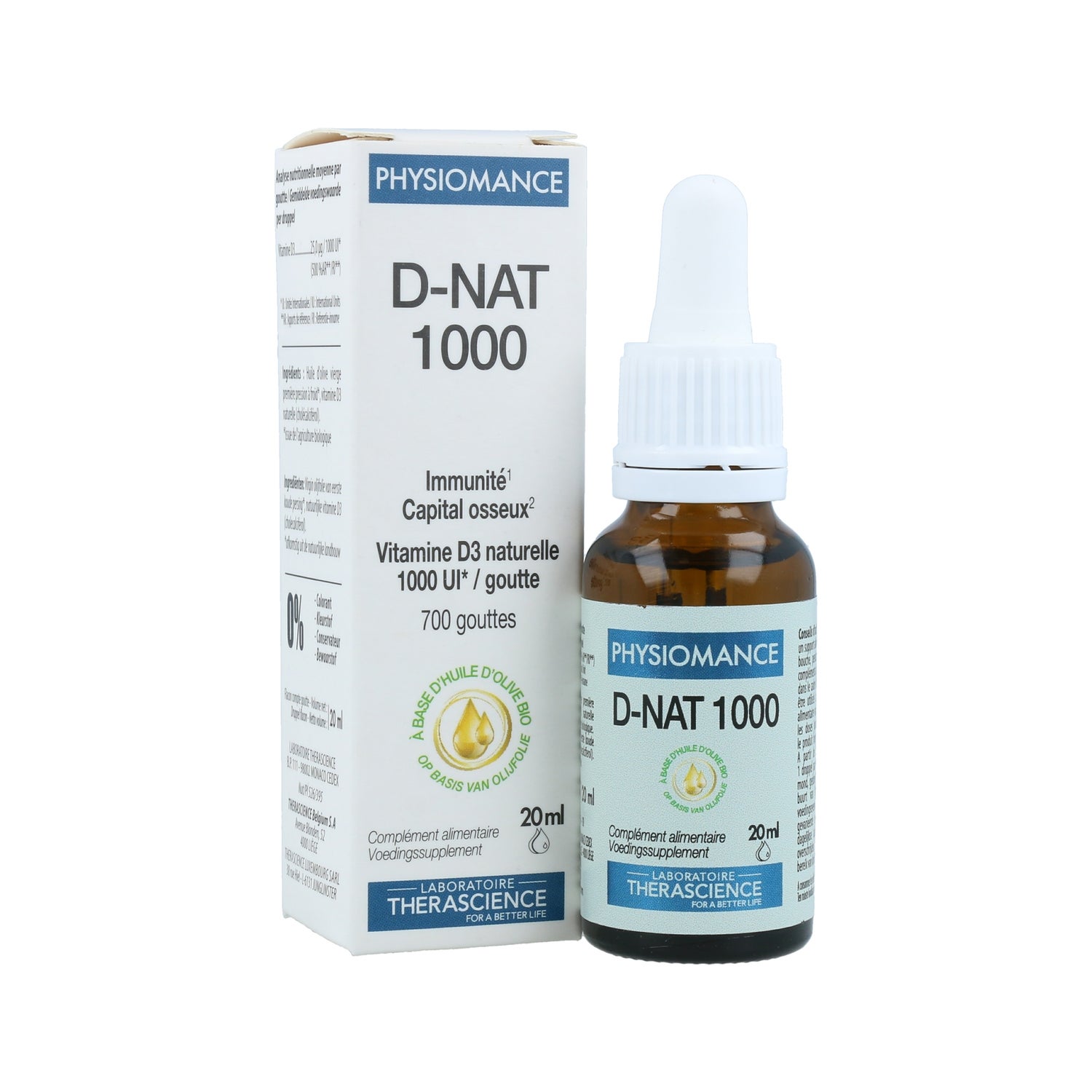 Therascience D-nat 1000 Gotas 20 Ml é um suplemento nutricional que contribui para a normal manutenção dos ossos e dentes, para o normal funcionamento muscular, para a absorção e manutenção dos níveis de cálcio e fósforo, para o normal funcionamento do sistema imunitário e para o processo de divisão celular, fornecendo uma dose adequada de vitamina D3, substância essencial para o metabolismo do cálcio e para a mineralização óssea. Proporciona todos estes benefícios de uma forma natural, sem interferir com os ciclos regulares do organismo e contribuindo para o seu correto funcionamento, sendo especialmente recomendado para mulheres nos períodos pré-menopausa e menopausa, uma vez que contribui para a manutenção da massa óssea. Sem glúten e sem lactose.