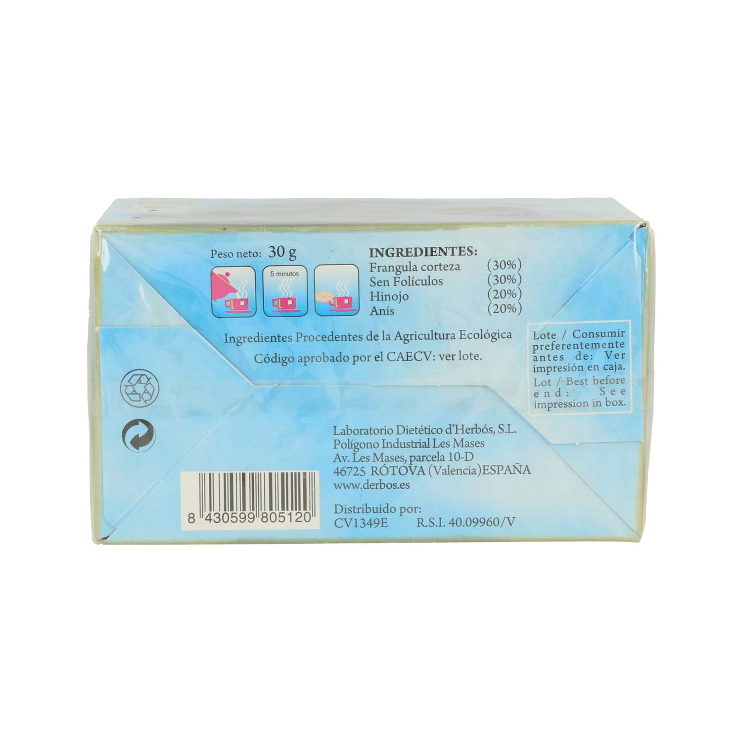 Derbos Infusão Bio Lax 20 Sobres é uma preparação para infusão que contém Frângula, Sen, Funcho e Anis, ingredientes que favorecem uma boa digestão. Recomenda-se tomar um envelope por dia, preferencialmente antes de deitar, com um copo de água. Não se aconselha o seu uso durante a gravidez, a amamentação ou em crianças menores de 12 anos. Em caso de mal-estar ou efeito adverso, deve-se suspender o uso e consultar um médico. Os ingredientes principais são Filtro de fibra de celulose, Extrato de plantago ovata e Extrato de frângula.