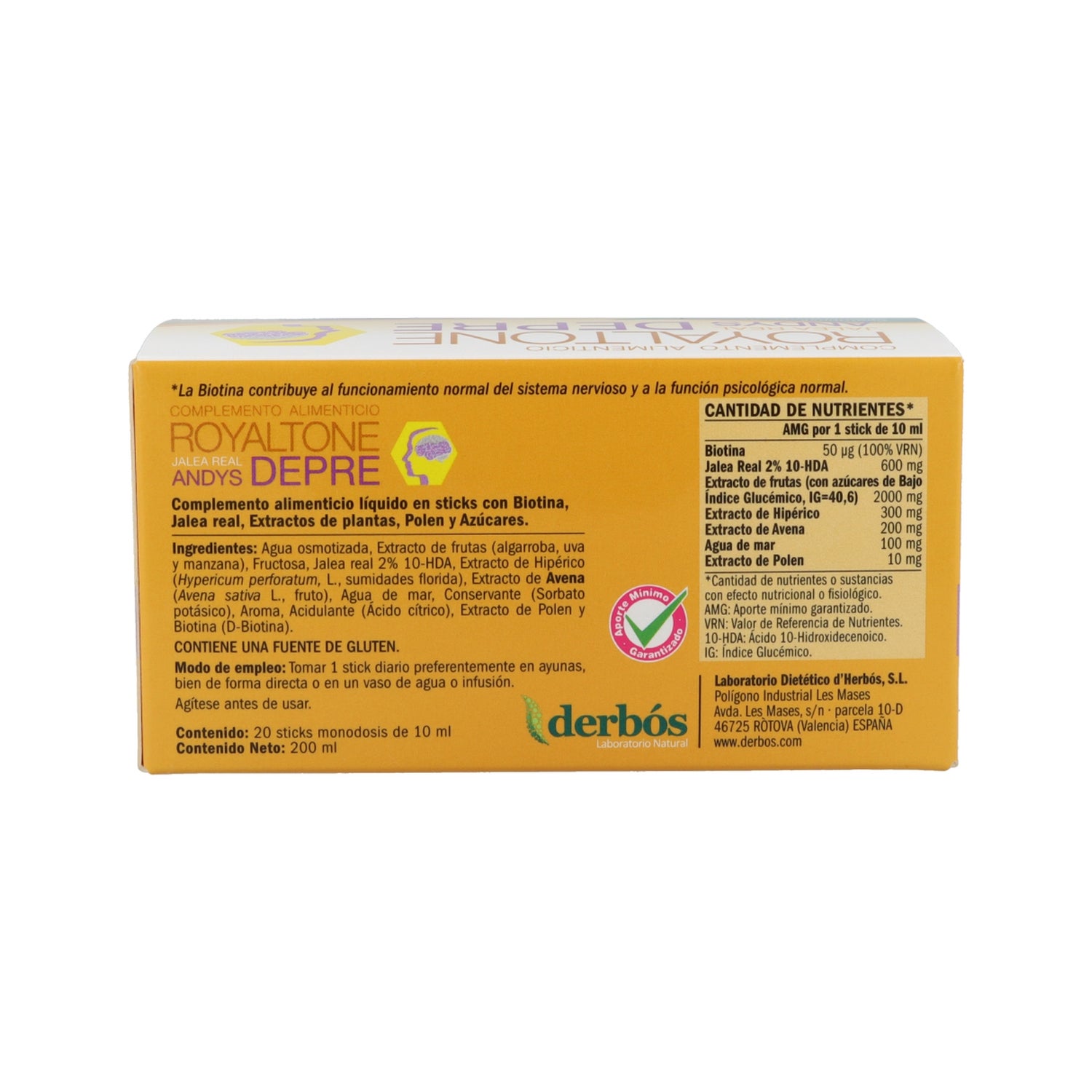Suplemento alimentar líquido à base de biotina, geleia real, extractos de plantas, pólen e açúcares que contribui para o normal funcionamento do sistema nervoso e favorece a manutenção de um bom estado psicológico. Recomenda-se que seja tomado de preferência com o estômago vazio, diretamente ou diluído num copo de água ou num chá de ervas. Agitar antes de utilizar. Não exceder a dose diária recomendada. Manter fora do alcance das crianças. Conservar em local fresco e seco, ao abrigo da luz solar direta.