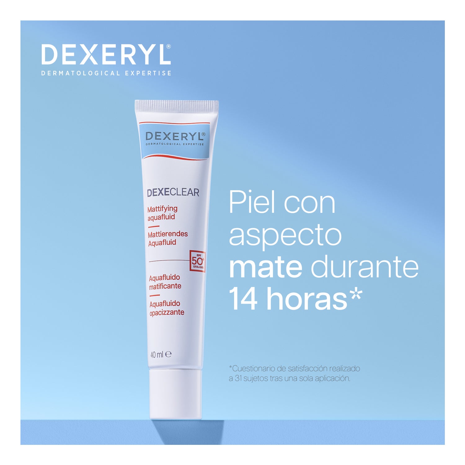 Segundo um questionário de satisfação, 94%* dos usuários confirmam a eficácia do produto para controlar os brilhos, 91%* observam uma redução diária do excesso de sebo e 74%** dos participantes notam que sua pele permanece matificada durante 14 horas. A textura leve de DEXECLEAR Aquafluido Matificante FPS 50+ garante hidratação durante seis horas*** após a primeira aplicação.