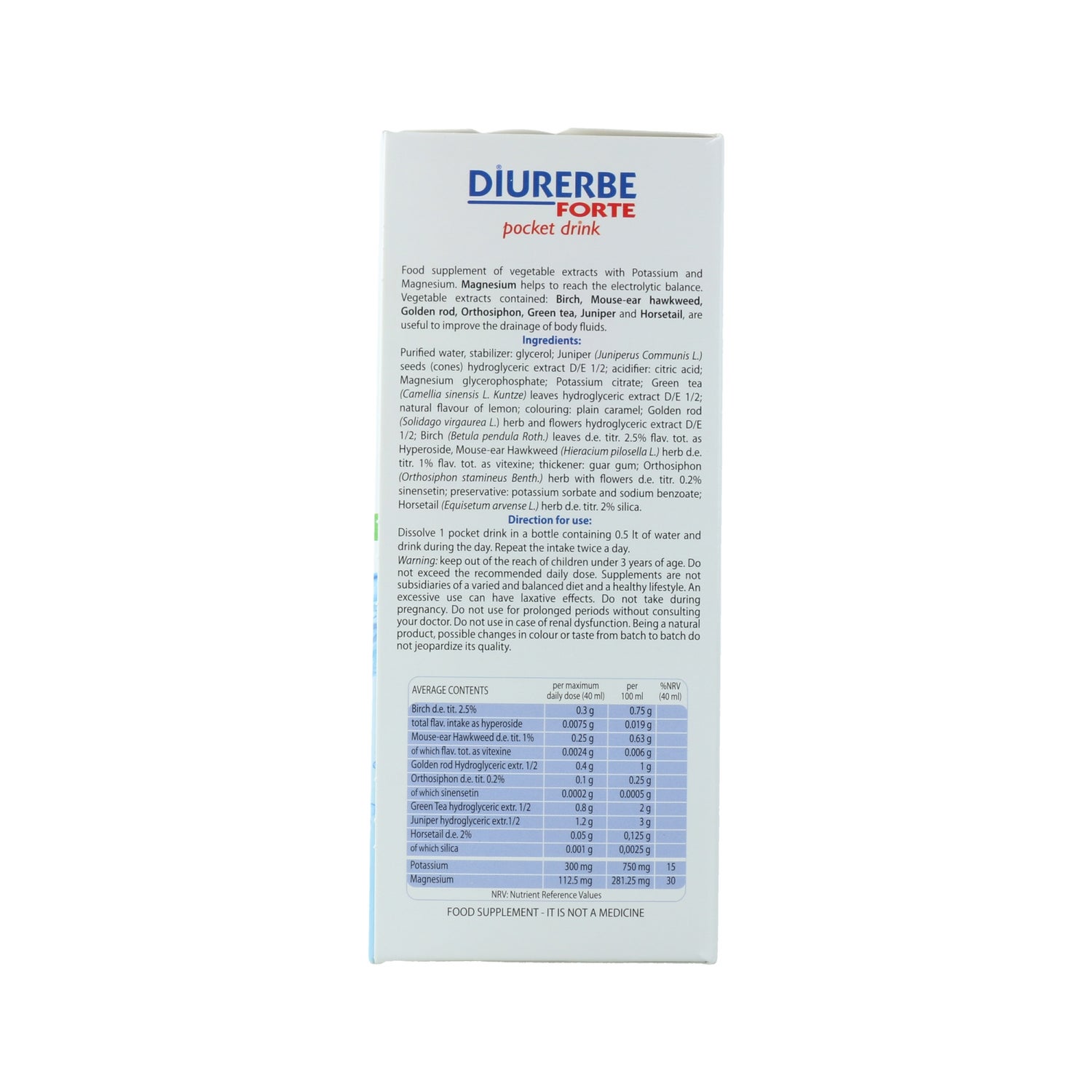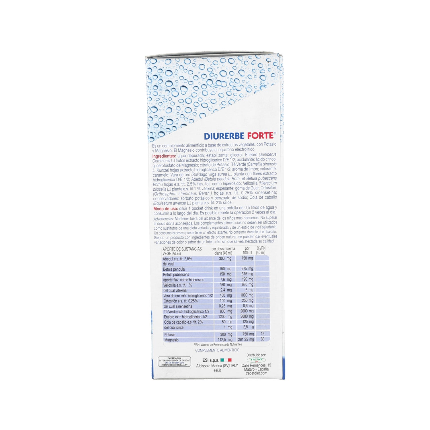 Diurerbe Forte Pocket Drink ajuda a expelir o excesso de fluido acumulado no corpo, tornando-o mais leve e confortável. Reduz os edemas das articulações inferiores produzidas por causa de uma circulação ou dieta incorreta, deixando um leve sabor cítrico.