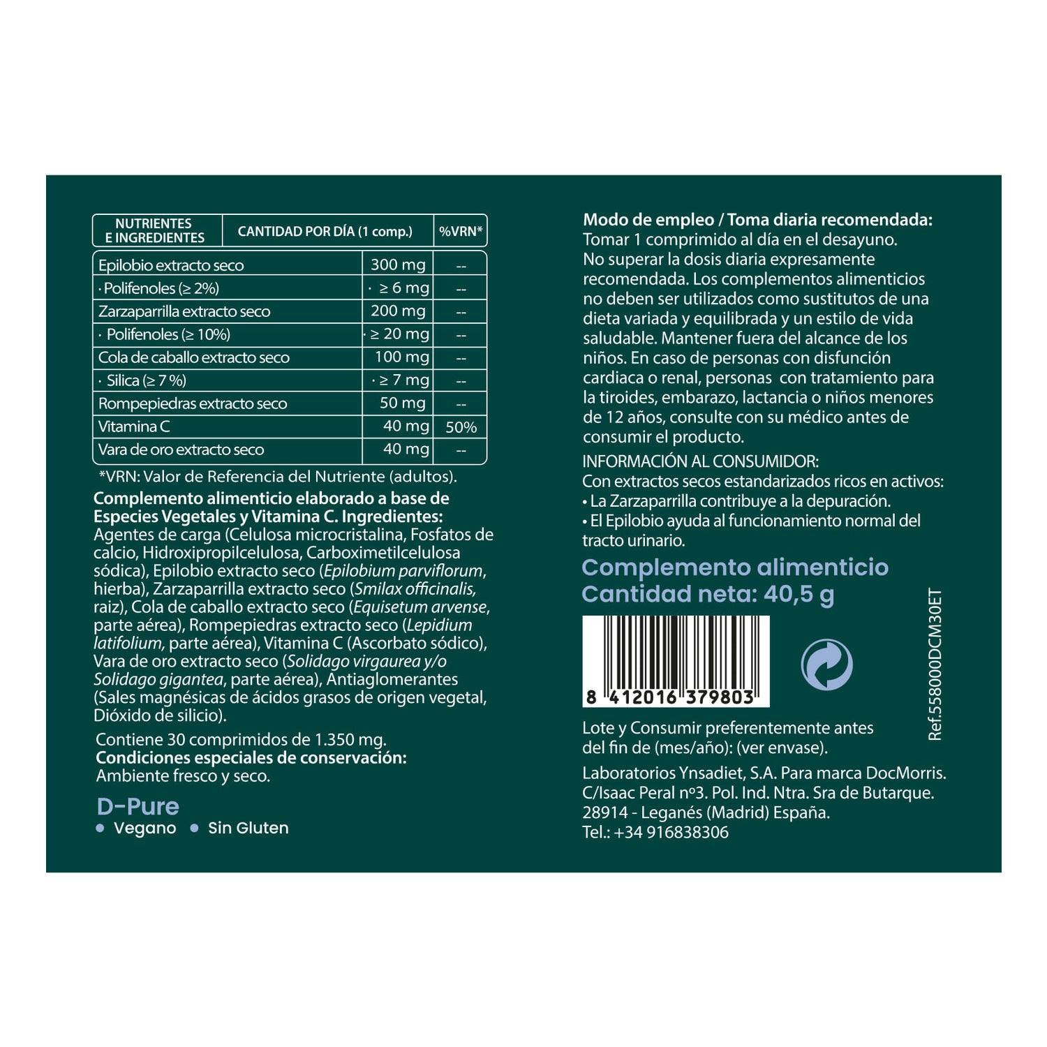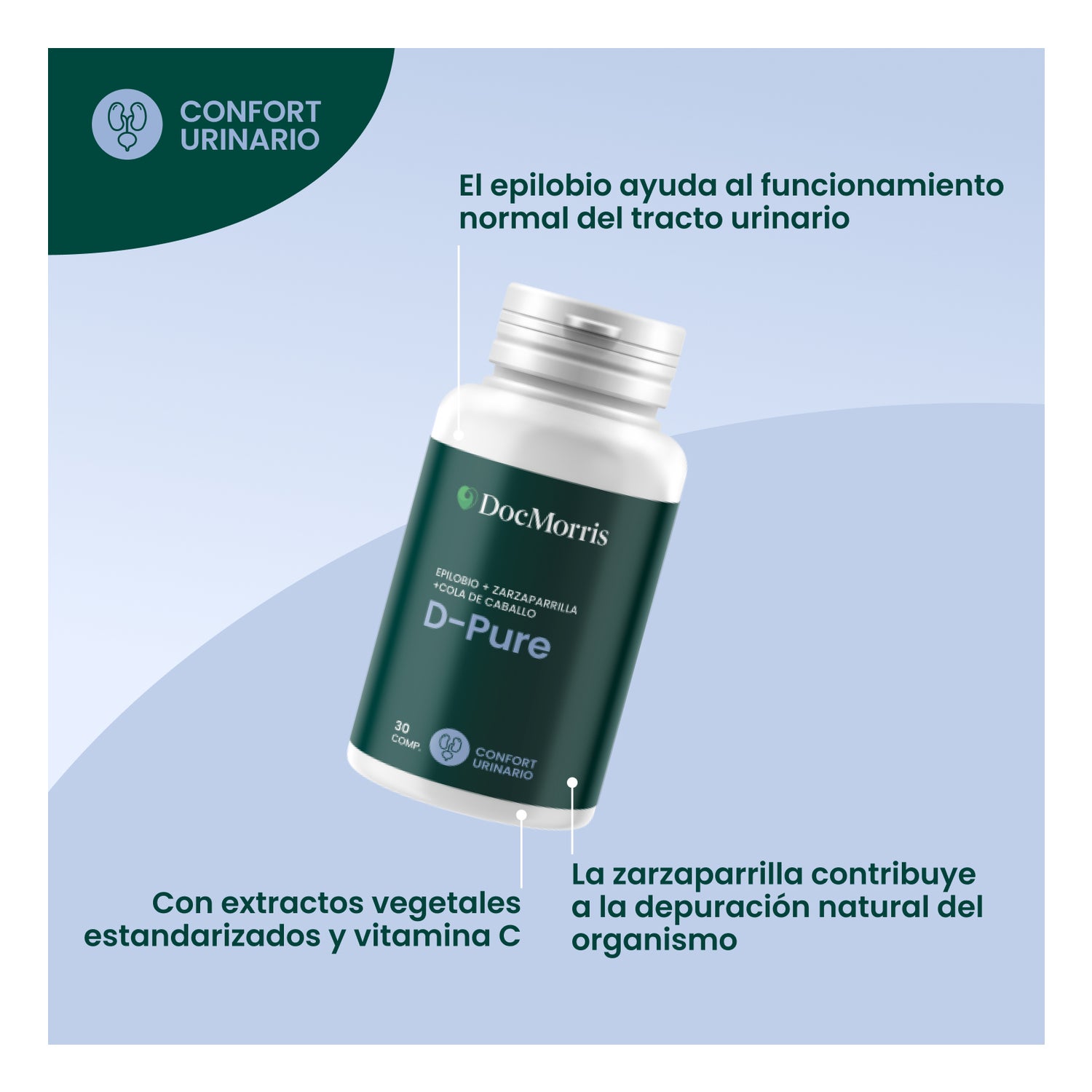DocMorris D-Pure 30Comp é um suplemento alimentar que contribui para o conforto urinário e para a depuração natural do organismo.
