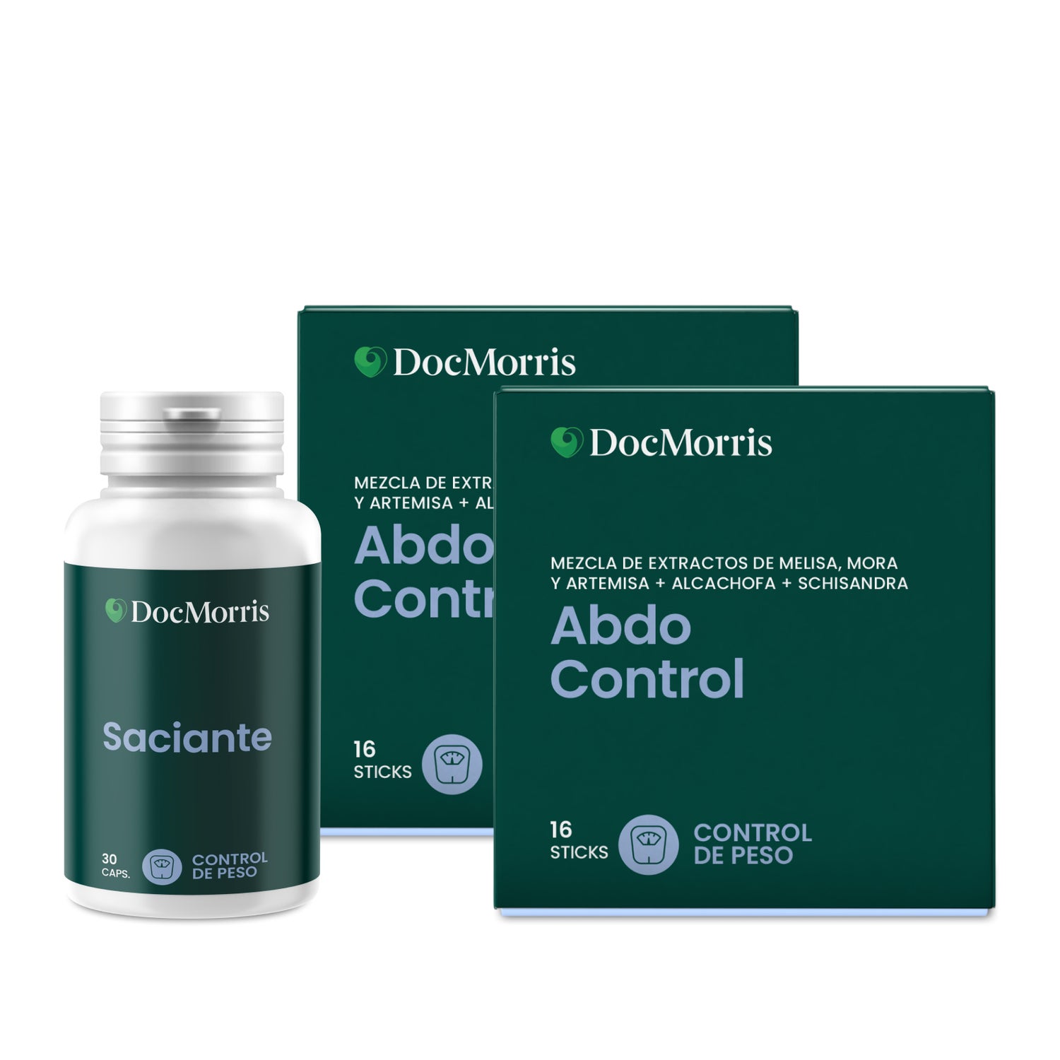 DocMorris Pack Saciante 30Caps 1 pc + Abdo Control 16 sticks 2 pcs é um conjunto de suplementos alimentares que auxiliam os processos de emagrecimento. Contém: