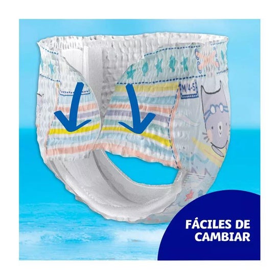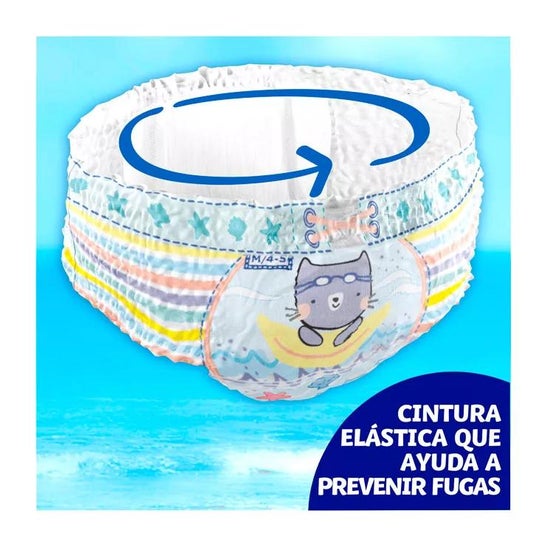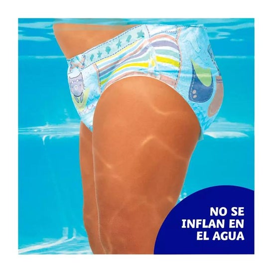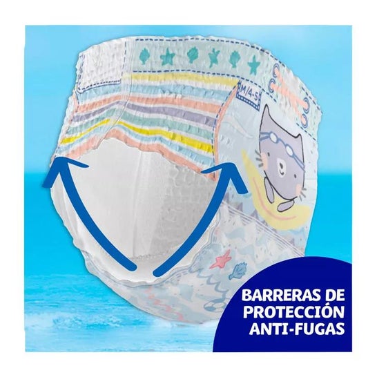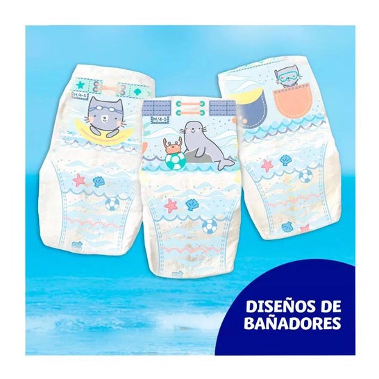 Fraldas descartáveis em formato de fato de banho para bebés entre 12 e 15kg. Ajudam a proteger os bebés da água e a prevenir qualquer fuga inesperada ao absorver a humidade do interior. A sua concepção garante que não incham em contacto com a água. Contém 10 unidades.