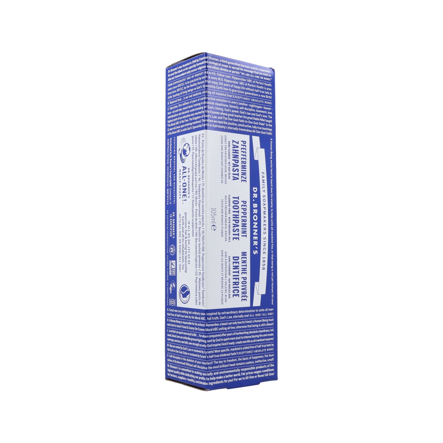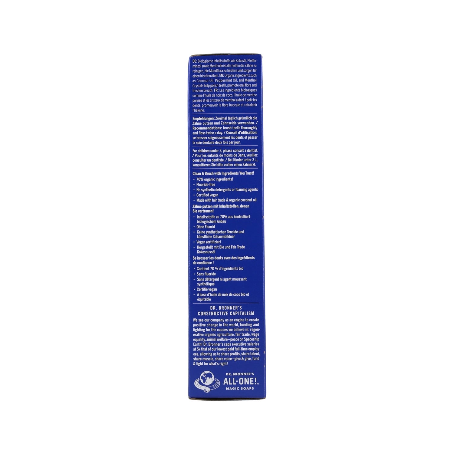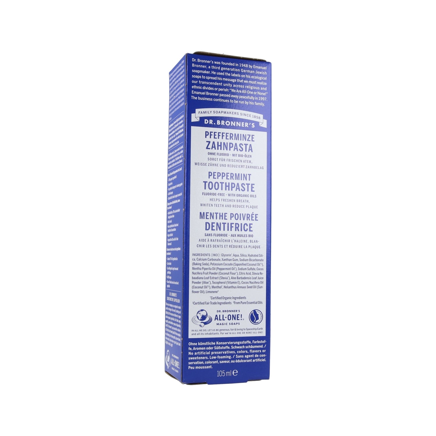 Dr. Bronners Pasta de Dentes Tudo em Um Menta 140g oferece uma higiene bucal natural e eficaz, perfeita para o cuidado integral da cavidade oral. Esta pasta combina uma limpeza profunda com uma sensação de frescor duradoura.
