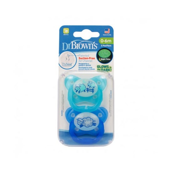 Chupeta Noturna de Silicone Dr Brown 0 a 6 Meses Azul 2uds é uma chupeta de uso noturno com bico reversível fabricado em silicone de grau médico. Pacote com 2 chupetas na cor azul.