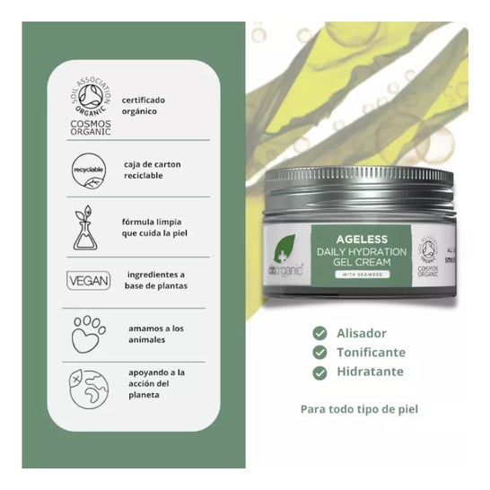 Dr. Organic Ageless Gel Creme Dia Algas Marinhas 50ml é um inovador gel creme projetado para o cuidado diário da pele. Esta fórmula leve e cremosa atua como um alisador e tonificante, proporcionando uma hidratação ideal e uma sensação de frescor ao longo do dia.