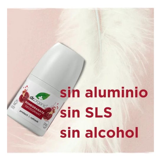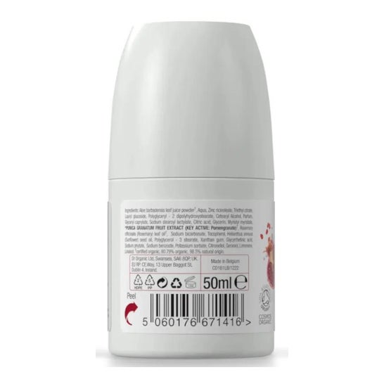 Dr Organic Organic Pomegranate Deodorant 50ml é um desodorizante roll-on rico em antioxidantes, principalmente ácido elágico e ómega 5. Enriquecido com aloé vera, óleo de girassol, musgo islandês e vitamina E, proporciona uma proteção de longa duração que respeita a barreira hidrolipídica da pele. Além disso, a sua fórmula actua sem fechar os poros.