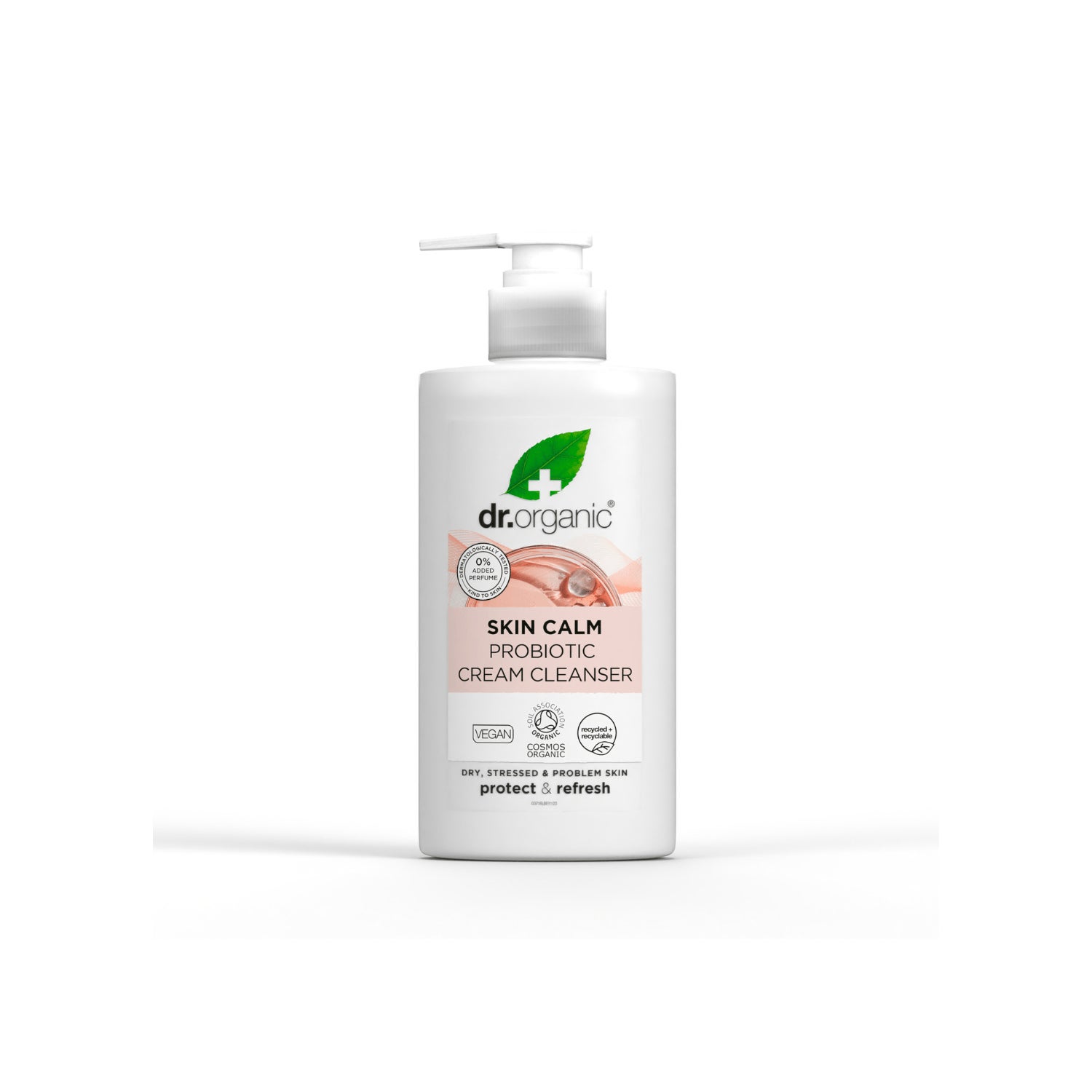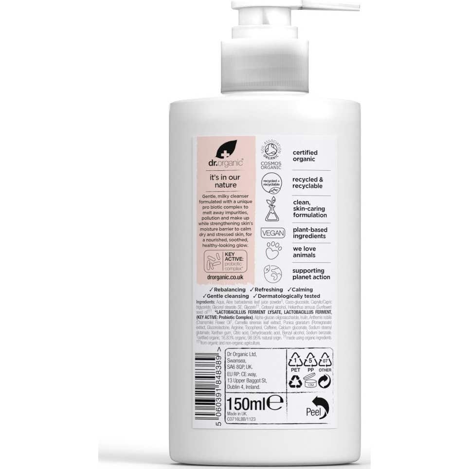 Dr. Organic Skin Calm Probiotic Creme Limpeza é um limpador suave de textura leitosa, criado para eliminar de maneira eficaz impurezas, maquiagem e poluição, sem comprometer a barreira natural da pele. Sua fórmula inclui probióticos e prebióticos, que ajudam a reforçar a microbiota cutânea, promovendo assim uma pele nutrida, calma e equilibrada.