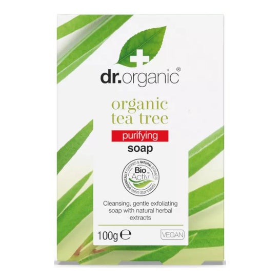 Dr Organic Tea Tree Soap bar 100g é um sabonete antibacteriano formulado com óleo de árvore do chá biológico rico em Terpinen-4-ol, um ingrediente ativo que lhe confere propriedades anti-sépticas. Enriquecido com folhas de chá verde e dotado de uma elevada ação de limpeza e antioxidante.