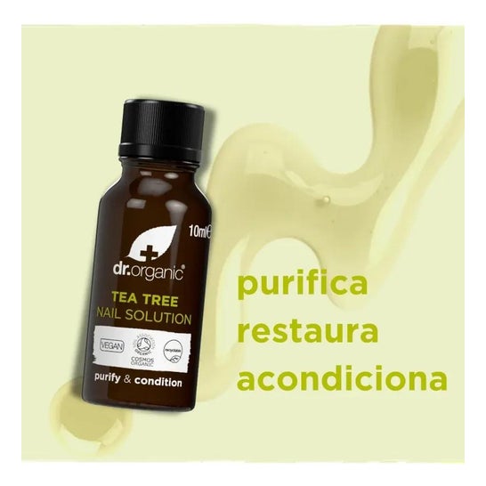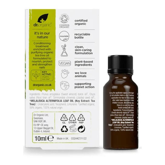 Dr Organic Tea Tree Nail Solution 10ml é um produto que regenera e fortalece as unhas rapidamente e tem propriedades anti-sépticas. Combina ingredientes bioactivos, tais como ácido undecilénico, óleo de amêndoas doces, óleo de farelo de arroz, óleo de jojoba e vitamina E.