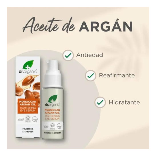 Dr Organic Instant Firming Eye Contour Serum Moroccan Argan Oil 300ml é uma fonte rica em vitaminas, antioxidantes, esteróis, ácidos gordos essenciais e vitamina E. Enriquecido com aloé vera, kigelia, baobá e hibisco e óleos essenciais, inclui proteínas do fruto de argão, que proporcionam uma ação reafirmante e suavizante.