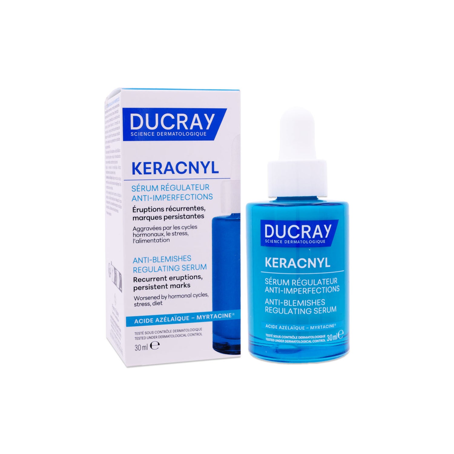 Ducray Keracnyl Sérum Regulador Antiimperfeições 30 ml é um tratamento projetado para combater as imperfeições da pele. Este sérum foca na regulação das erupções de acne, especialmente nas etapas do ciclo hormonal, como:
