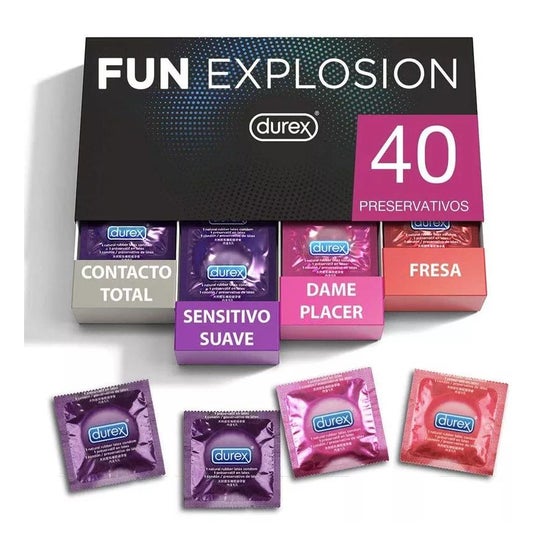 Durex Fun Explosion 40 pcs é um pacote composto por uma seleção de preservativos variados para explorar diferentes sensações e adicionar diversão extra às relações sexuais.