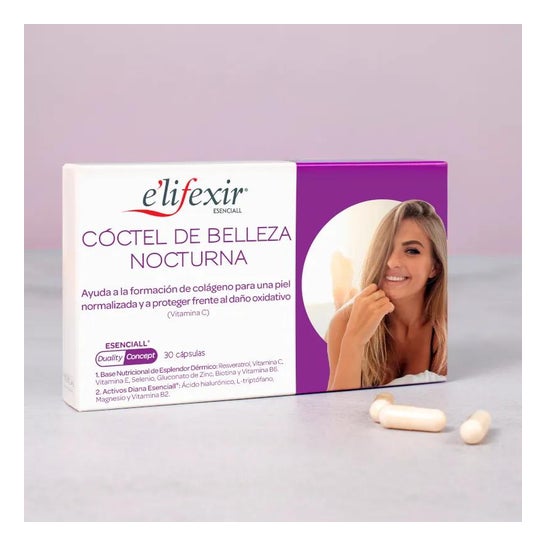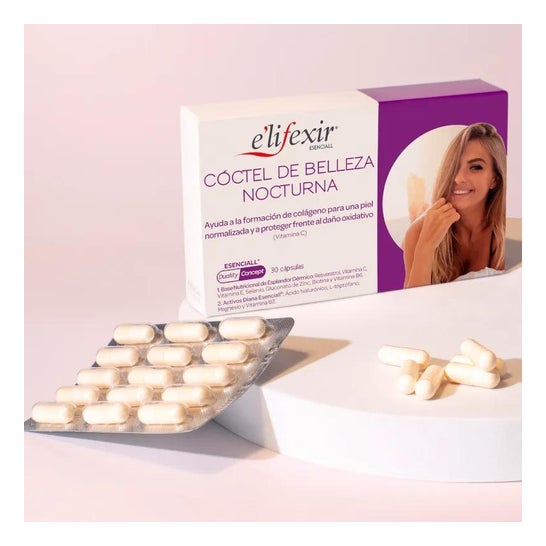 E'lifexir Night Beauty Cocktail é um tratamento oral que lhe fornece um conjunto de nutrientes essenciais para manter uma boa condição de pele: vitamina B2, vitamina E e selénio.