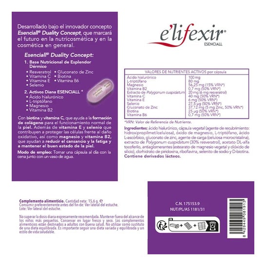BASE NUTRICIONAL DO ESPLENDOR DÉRMICO: RESVERATROL, VITAMINA C, VITAMINA E, SELÉNIO, GLUCONATO DE ZINCO, BIOTINA, VITAMINA B6, PRINCÍPIOS ACTIVOS ESSENCIAIS: ÁCIDO HIALURÓNICO, L-TRIPTOFANO, MAGNÉSIO, VITAMINA B2.