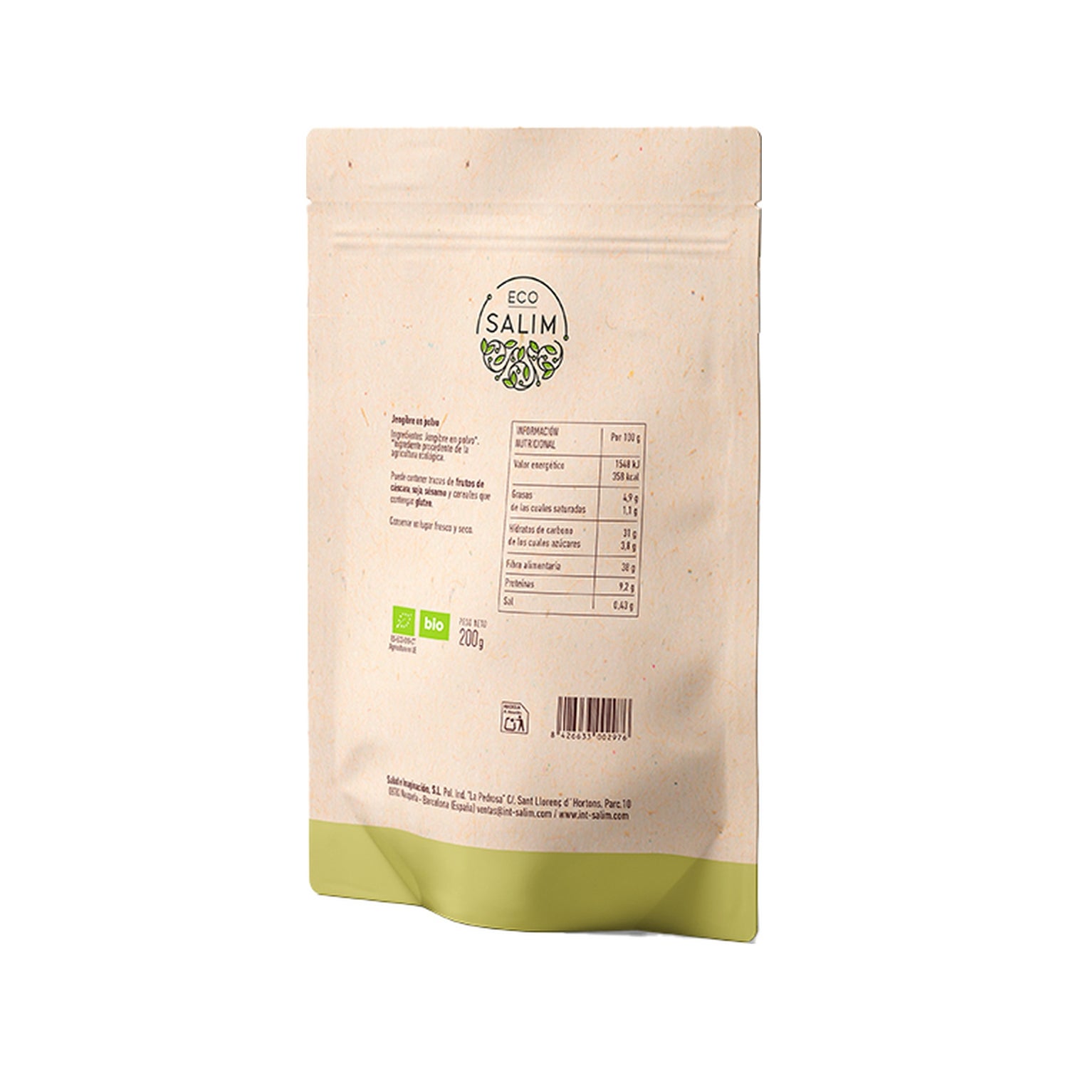 Gengibre em pó orgânico apresentado numa embalagem de 200g. Pode ser adicionado a sobremesas, bolachas, guisados, molhos, pães, etc. Além de ser um tempero orgânico e vegano, é conhecido pelas suas boas propriedades para a saúde. O gengibre favorece os processos digestivos, ajuda a reduzir as náuseas e a diminuir as dores musculares graças às suas propriedades anti-inflamatórias. Contribui também para uma boa saúde cardiovascular.