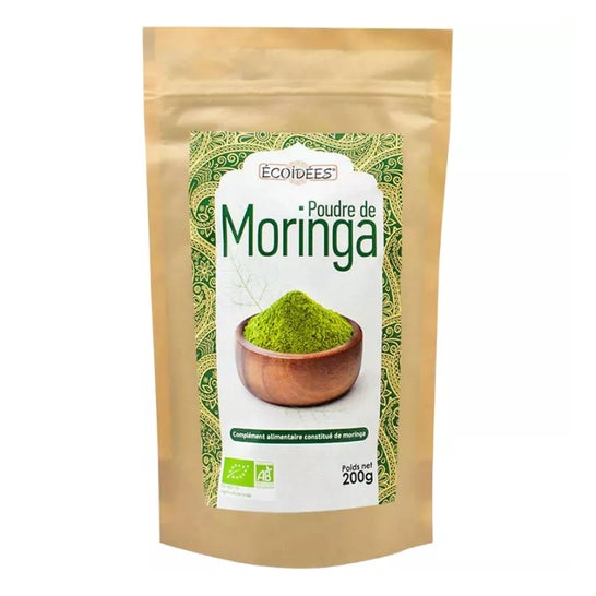 Ecoidées Moringa Ecológica em Pó 200g é um poderoso cocktail de nutrientes 100% vegetal e sem glúten, preparado com as folhas secas naturais da árvore de moringa, colhidas na Índia. A moringa é uma fonte de vitaminas B, C, provitamina A e K, além de ser rica em aminoácidos essenciais, proteínas, ferro, potássio e manganês. Tem a reputação de estimular o sistema imunitário e reduzir a fadiga. Além disso, o óleo de Moringa, utilizado tanto interna como externamente, é famoso pelos seus benefícios para a pele. Os suplementos alimentares devem ser utilizados como parte de um estilo de vida saudável e não devem ser consumidos como substituto de uma dieta variada e equilibrada.