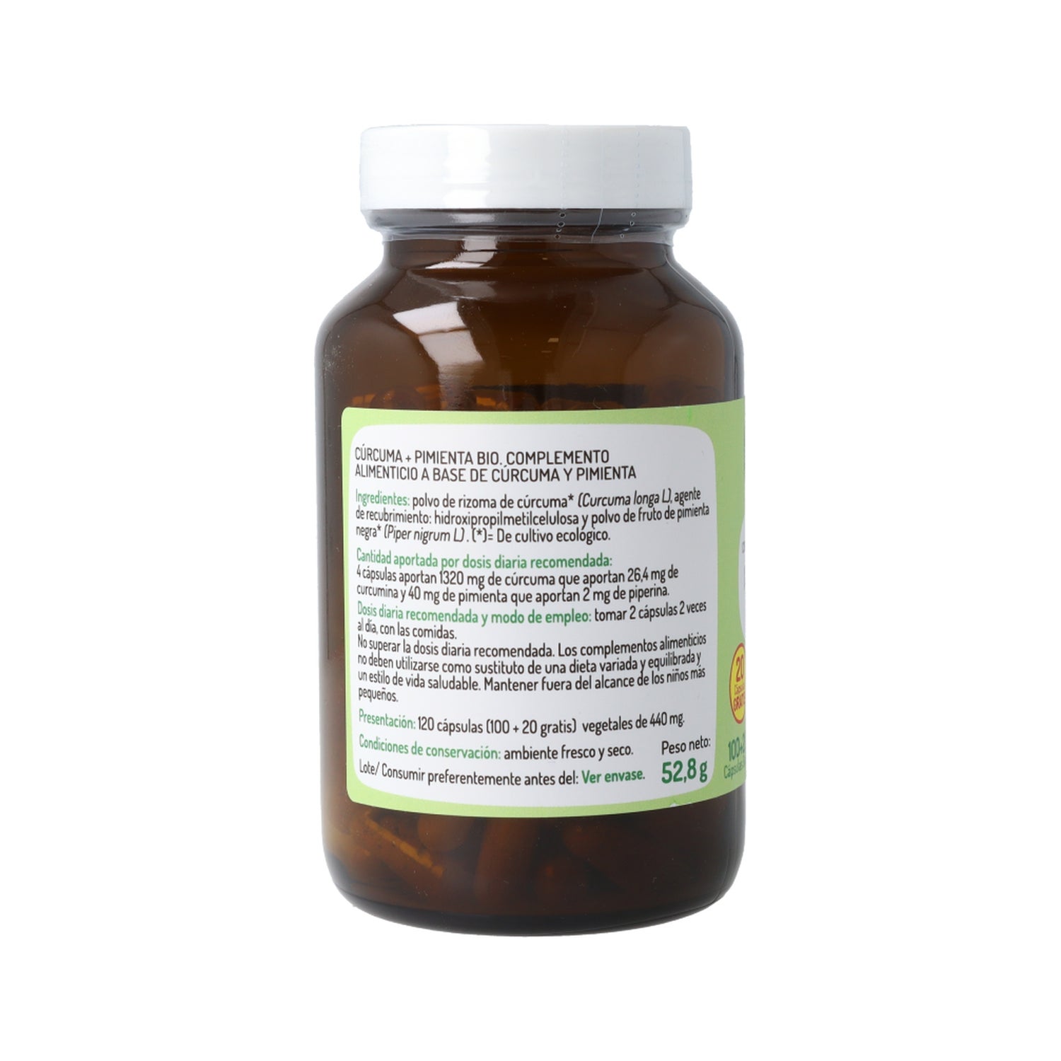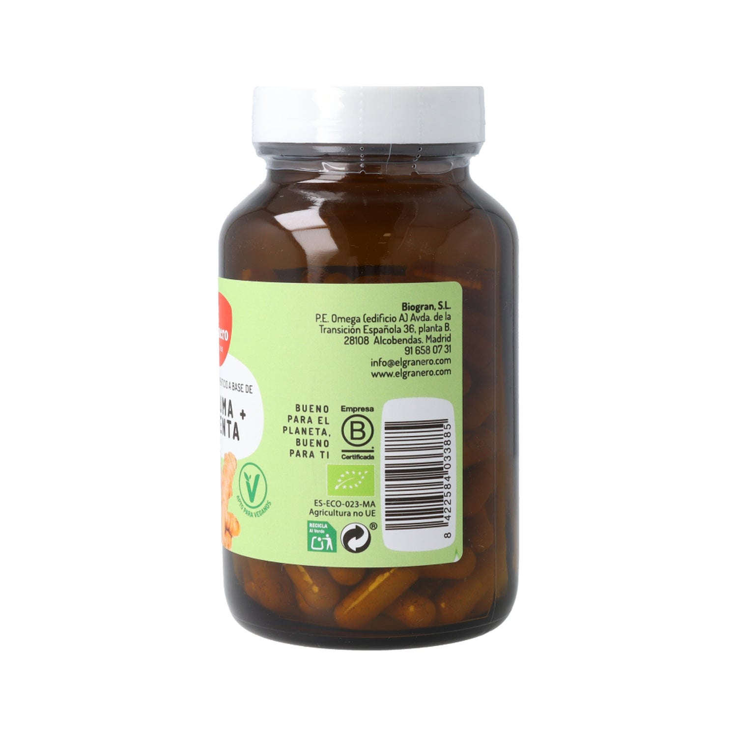 Suplemento alimentar que ajuda contra artrite, síndrome do intestino irritável ou qualquer processo inflamatório, funções hepáticas e previne intoxicações alimentares, estimula a secreção da bílis e promove o bom funcionamento do fígado, tonifica, relaxa a mente e o corpo. Feito a partir de curcuma e pimenta com ingredientes cultivados organicamente. Adequado para veganos.