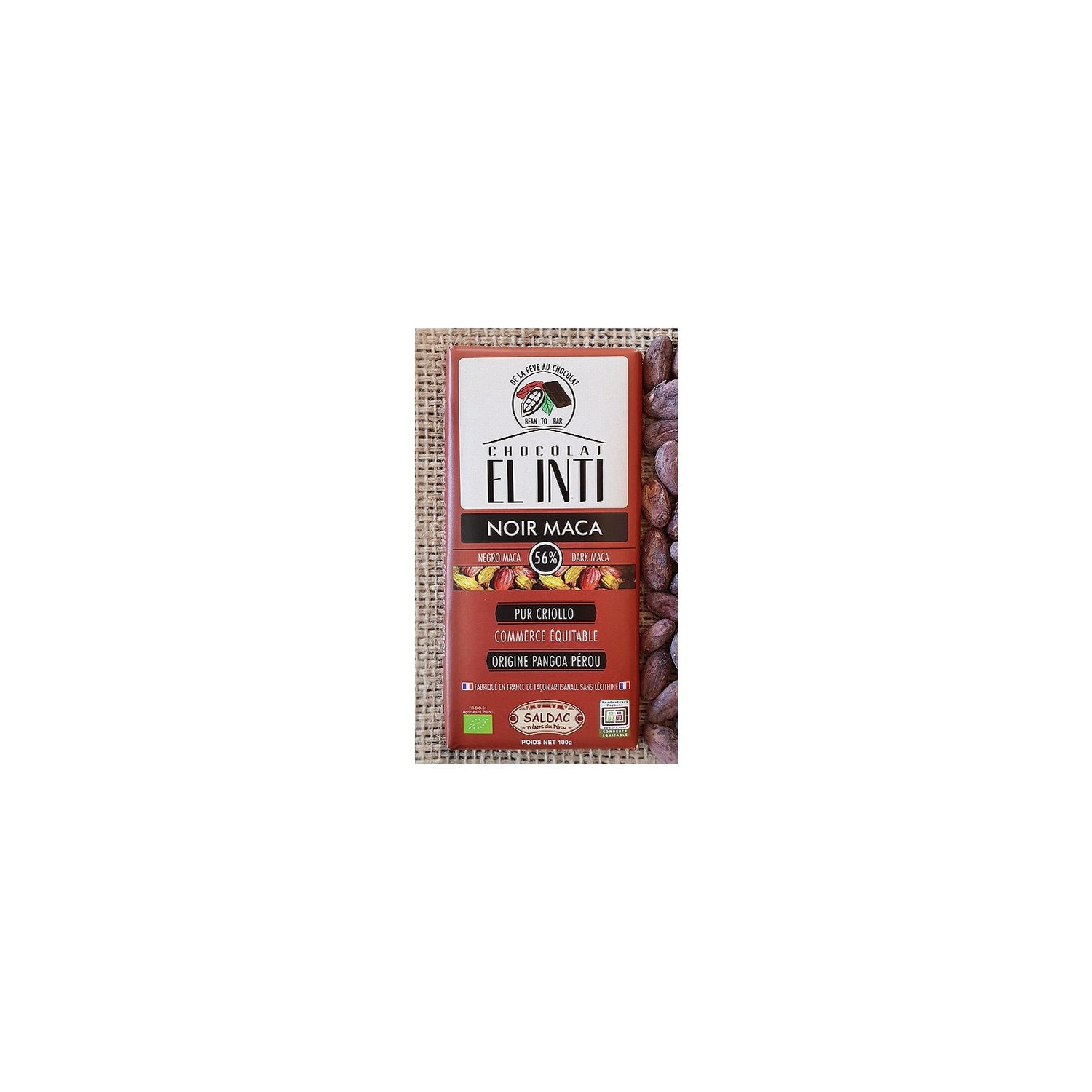 Chocolate Negro com Maca de origem biológica com certificado verde que garante que é um produto que foi elaborado inteiramente com produtos provenientes da agricultura ecológica, sendo respeitosos com o meio ambiente. Trata-se de um produto adequado para uma alimentação vegetariana e vegana.