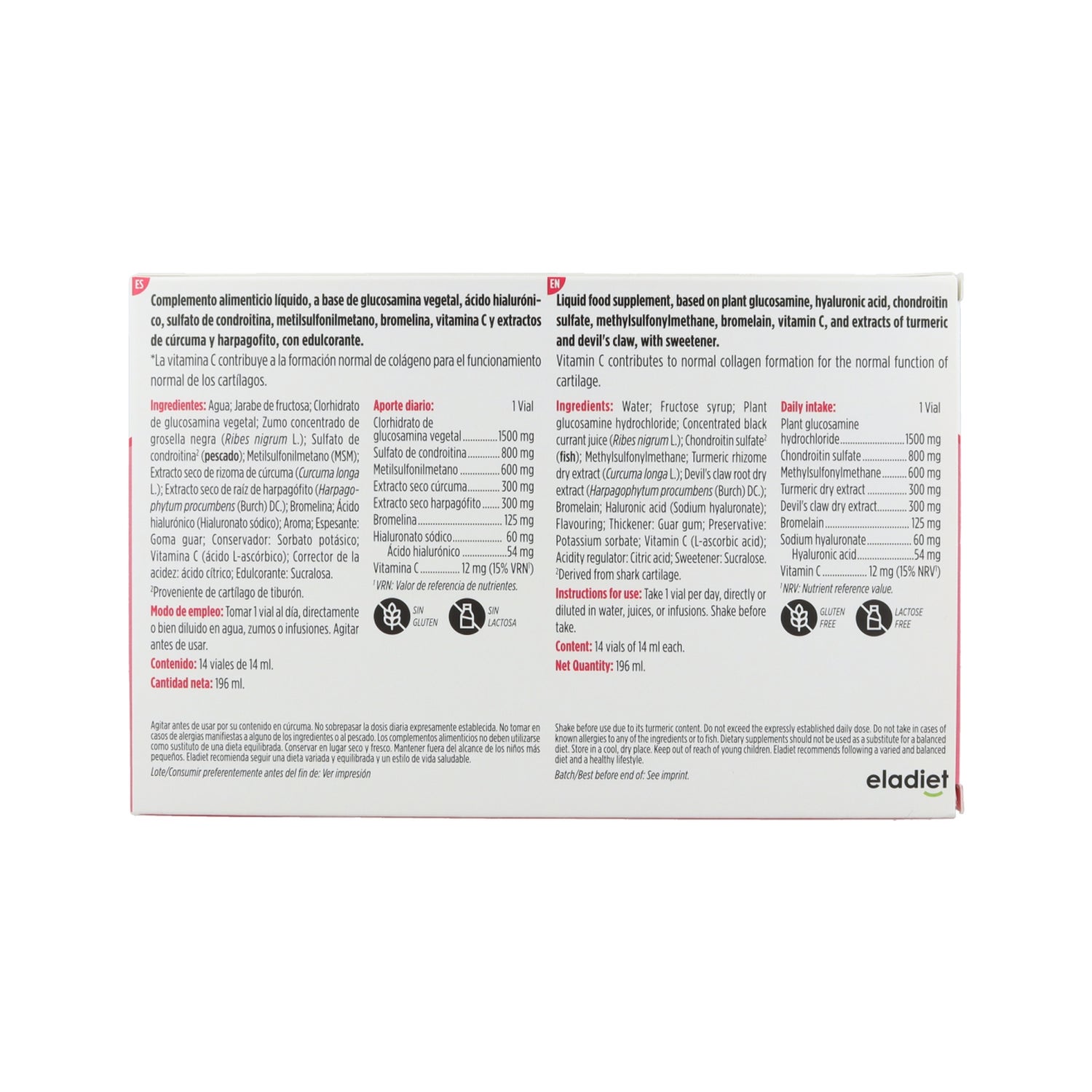 Glucosamina vegetal 1500 mg, sulfato de condroitina 800 mg, metilsulfonilmetano 600 mg, extracto de curcuma 300 mg, extracto de harpagófito 300 mg, bromelaína 125 mg, ácido hialurónico 60 mg. Outros: Água, xarope de frutose, suco de groselha preta concentrado (6%), aroma, goma guar (espessante), sorbato de potássio (conservante), ácido cítrico (regulador de acidez), sucralose (adoçante).