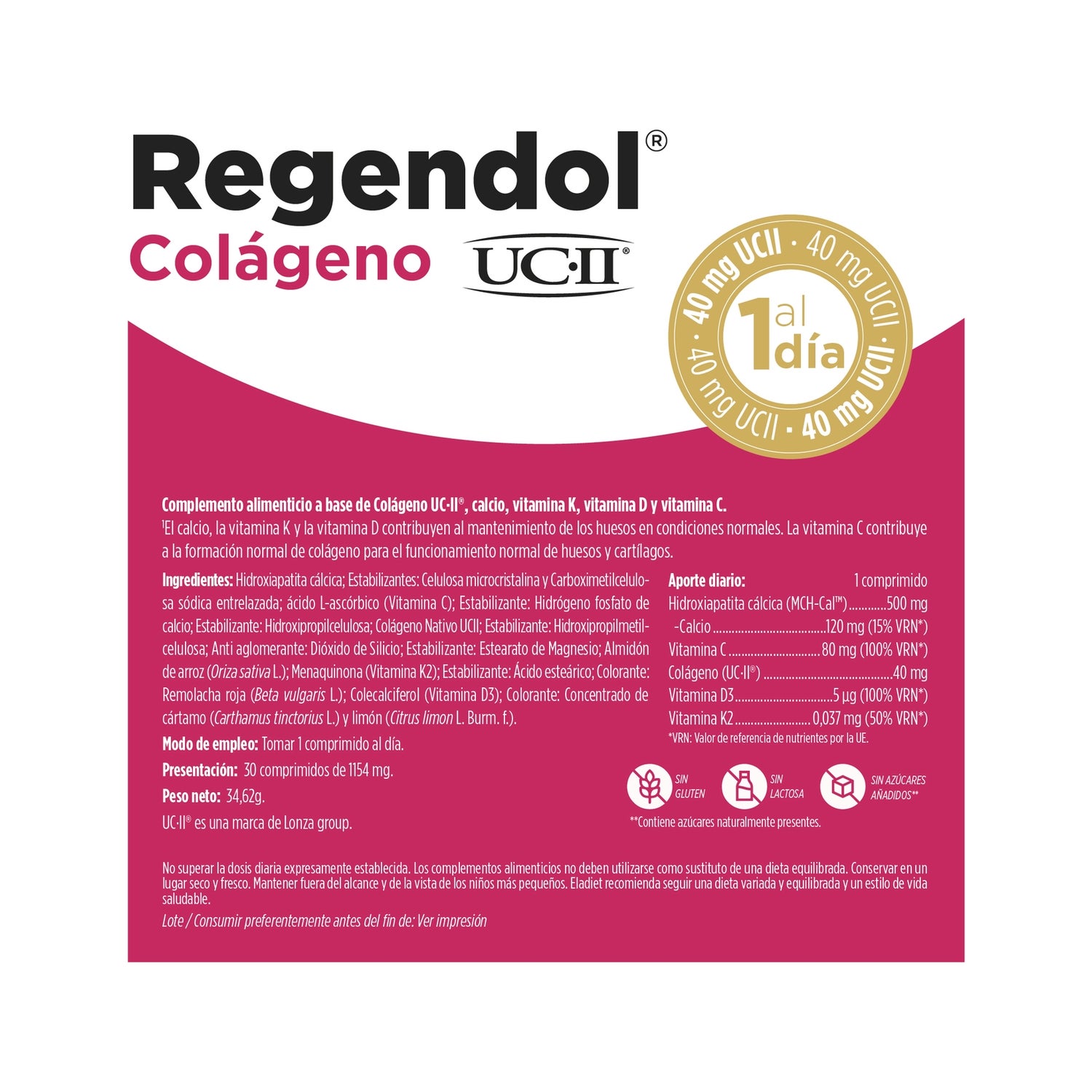 Eladiet Regendol Uc-Ii 30 comprimidos é um suplemento alimentar que ajuda a nutrir, redensificar e recuperar os ossos e as articulações. Formulado com colagénio UC-II®, hidroxiapatite de cálcio, vitamina K2, vitamina D3 e vitamina C. Contém dois tipos de colagénio: O tipo I ocupa 90% do colagénio presente no organismo e encontramo-lo na pele, nos ossos, nos discos intervertebrais, nos tendões e na córnea; e o tipo II que é o principal componente dos discos intervertebrais e dos olhos. Indicado para a recuperação e redensificação das articulações e dos ossos.