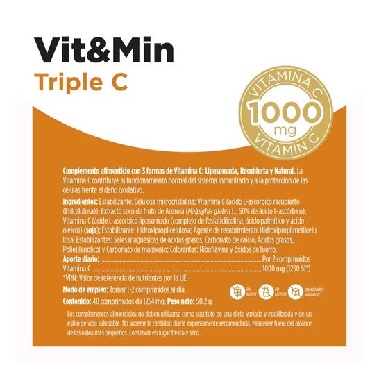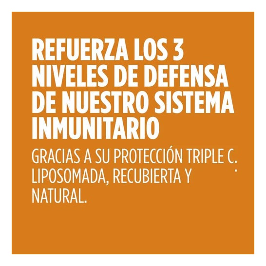 Suplemento alimentar em comprimidos, contendo três formas de vitamina C de acerola (lipossomal, revestida e natural), que ajuda a reforçar o sistema imunitário e ajuda a proteger as células dos danos oxidativos. Ao apresentar-se em três formas, tem três tempos de absorção diferentes no organismo, evitando níveis de saturação no plasma e conseguindo uma maior concentração e duração na corrente sanguínea.
