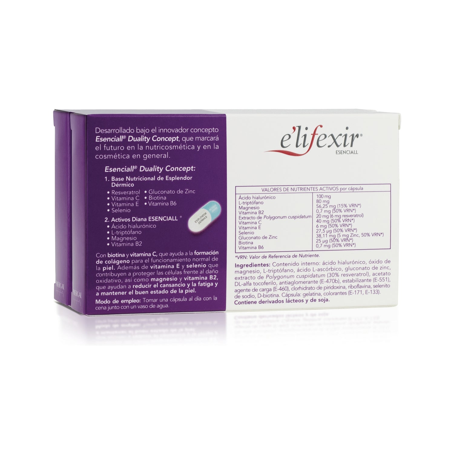 Elifexir Esenciall Night Beauty Cocktail 60 cápsulas é um suplemento alimentar que apoia a formação de colagénio para uma pele normalizada e protege contra os danos oxidativos. Desenvolvido sob o inovador conceito Esenciall Duality, que marca o futuro da nutricosmética e da cosmética em geral. Contém Resveratrol, Vitamina C, Vitamina E, Selénio, Gluconato de Zinco, Biotina, Vitamina B6, Ácido Hialurónico, L-Triptofano, Magnésio e Vitamina B2. Com biotina e vitamina c para a formação de colagénio, vitamina e e selénio para proteger as células contra os danos oxidativos e magnésio e vitamina b2 para reduzir o cansaço e a fadiga e manter a pele em boas condições.