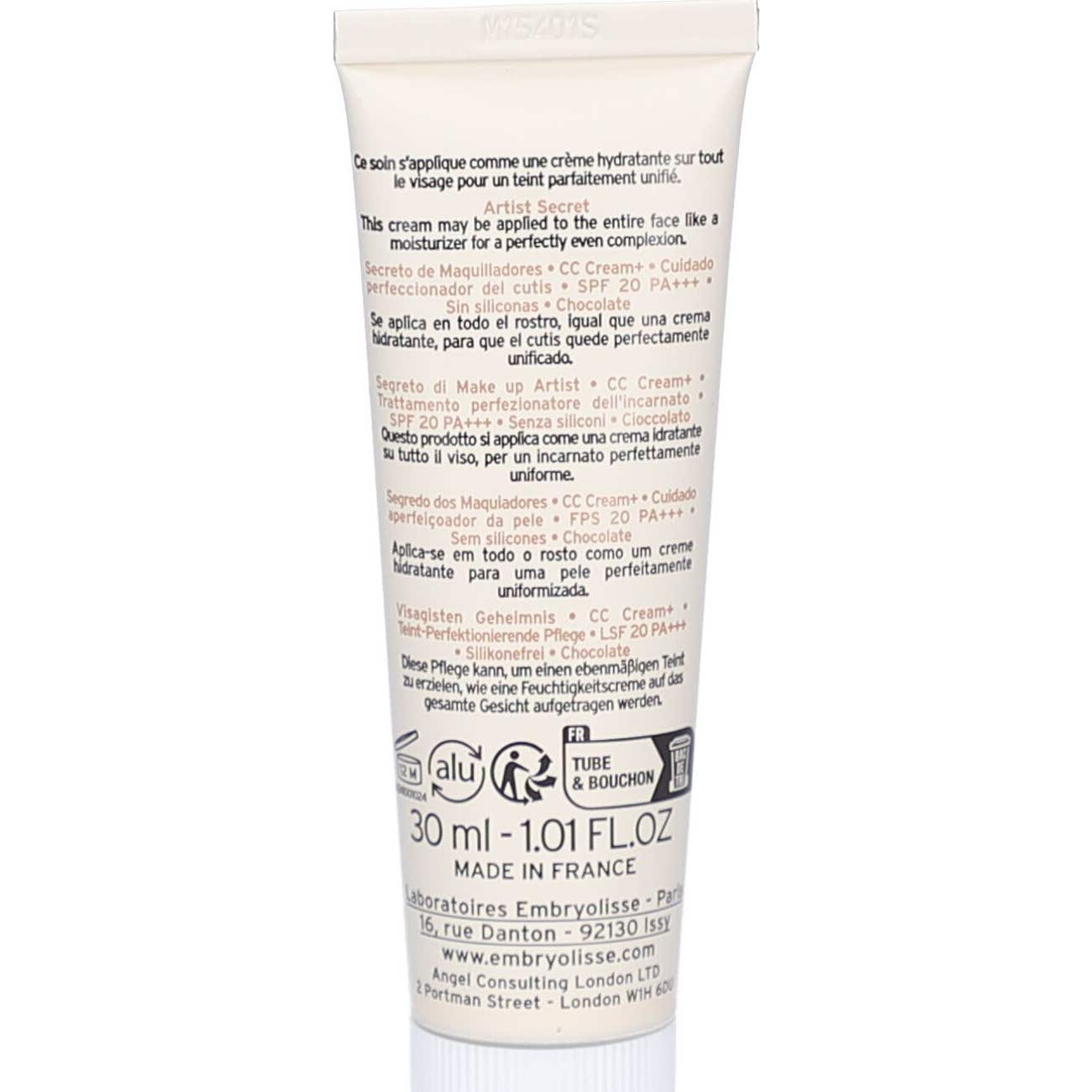 Embryolisse CC Cream+ Spf20 Chocolate 30 ml é um produto inovador no campo da maquiagem e do cuidado da pele. Apresenta-se como um aperfeiçoador de tom que combina a função de maquiagem com benefícios para a pele, adaptando-se a todos os tipos de pele e tonalidades.