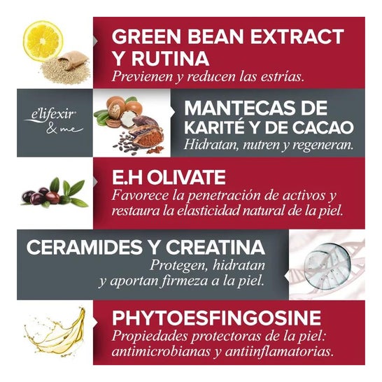 A emulsão anti-estriasE'Lifexir®é um creme que confere à pele toda a elasticidade necessária para recuperar a sua aparência habitual. É um tratamento inovador de tripla acção: previne, reparae retarda a formação de estrias na pele. Ajuda a prevenir a formação denovas estrias, reduz a sua profundidade em 72% e maximiza a formação de colagénio.