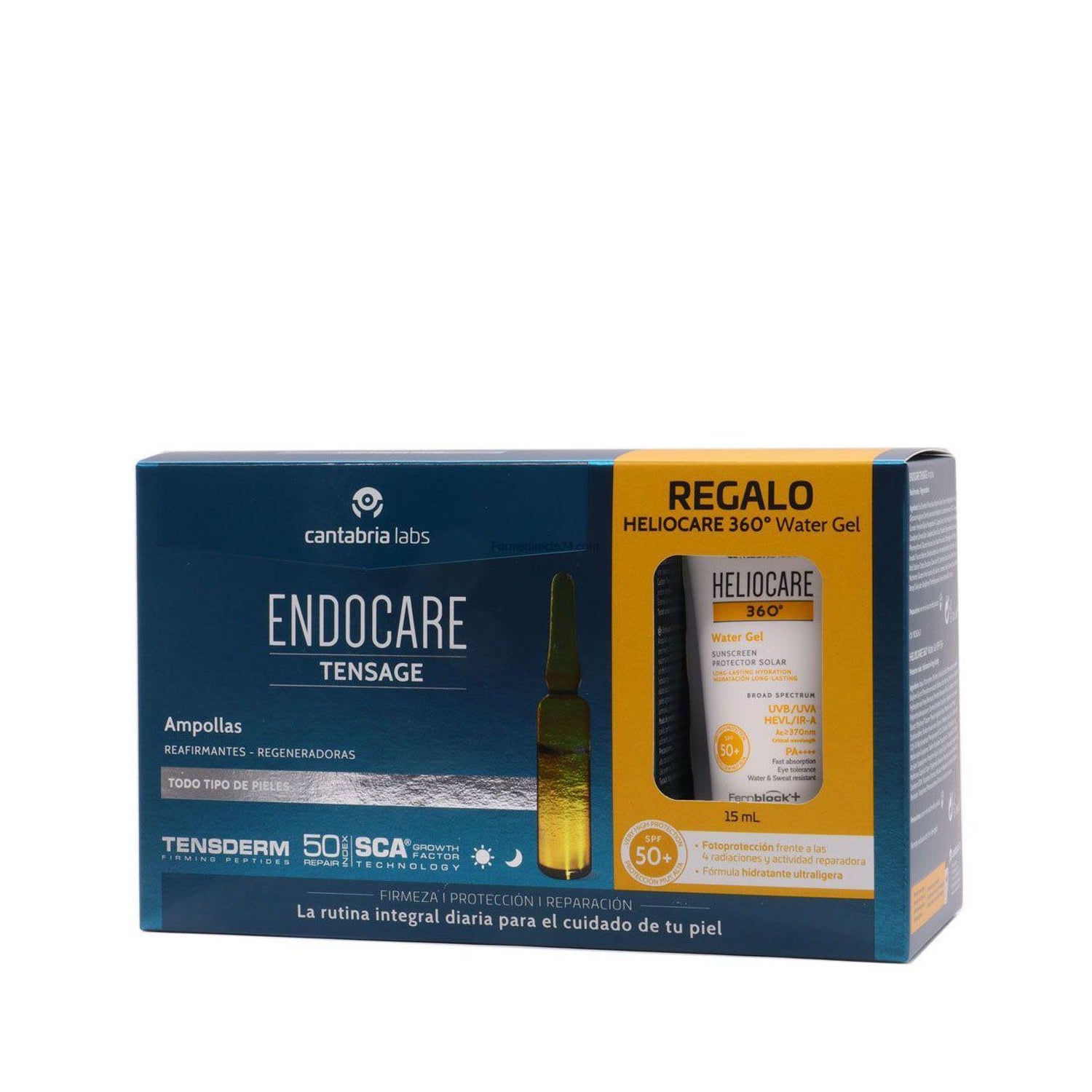 Endocare Tensage Ampolas + Heliocare 360º Water Gel SPF50 é um pacote anti-envelhecimento que consiste em 20 ampolas firmes e regeneradoras de Tensage e Heliocare 360º Water Gel SPF50 15ml de protecção solar.