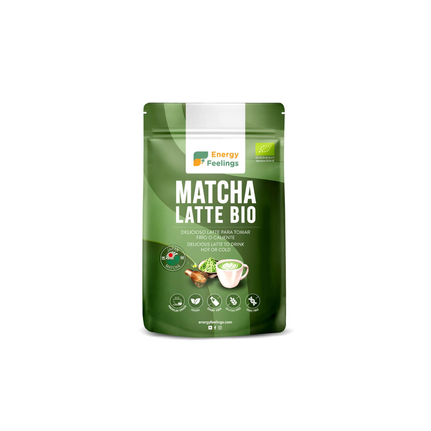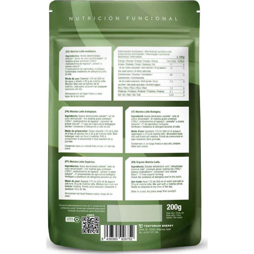 Energy Feelings Matcha Latte Bio 200 gr é um matcha latte ecológico certificado elaborado com chá matcha premium e uma base cremosa de aveia e coco. Não contém glúten nem açúcares adicionados.