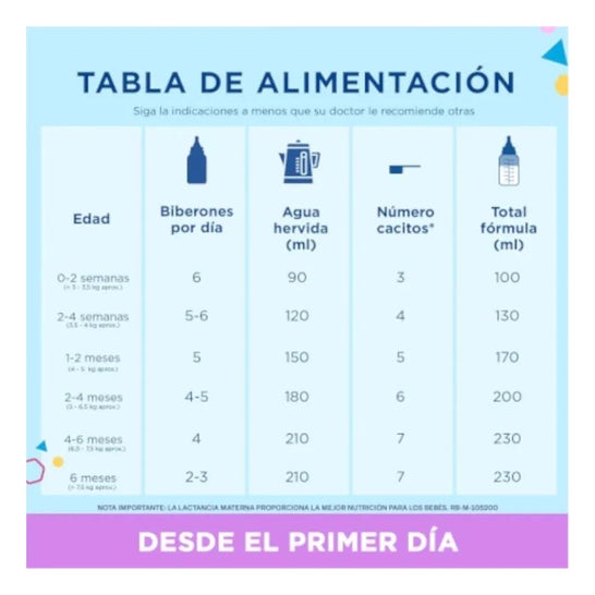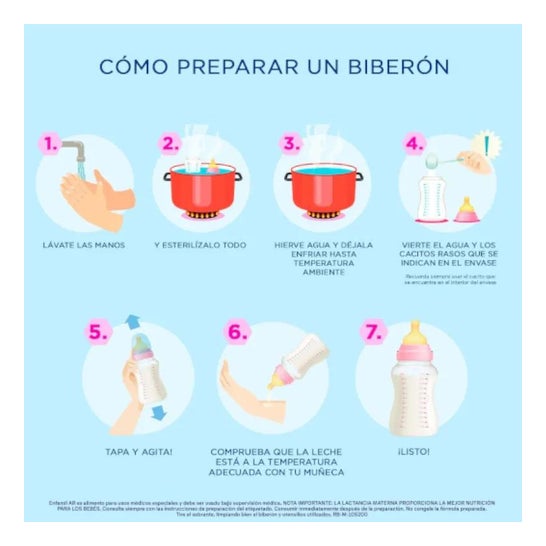 Aquecer a água a 40º. Misture a água com as medidas do leite de acordo com as indicações que aparecem na embalagem ou com as instruções dadas pelo pediatra. Agite ou mexa até dissolver completamente.